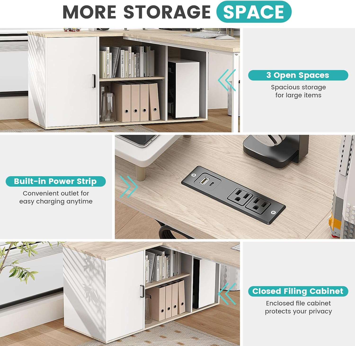 71" L Shaped Executive Desk, Executive Office Desk with File Cabinet and Power Outlet, Large Computer Table with Shelves, Business Furniture Workstation for Home Office (Oak & White)