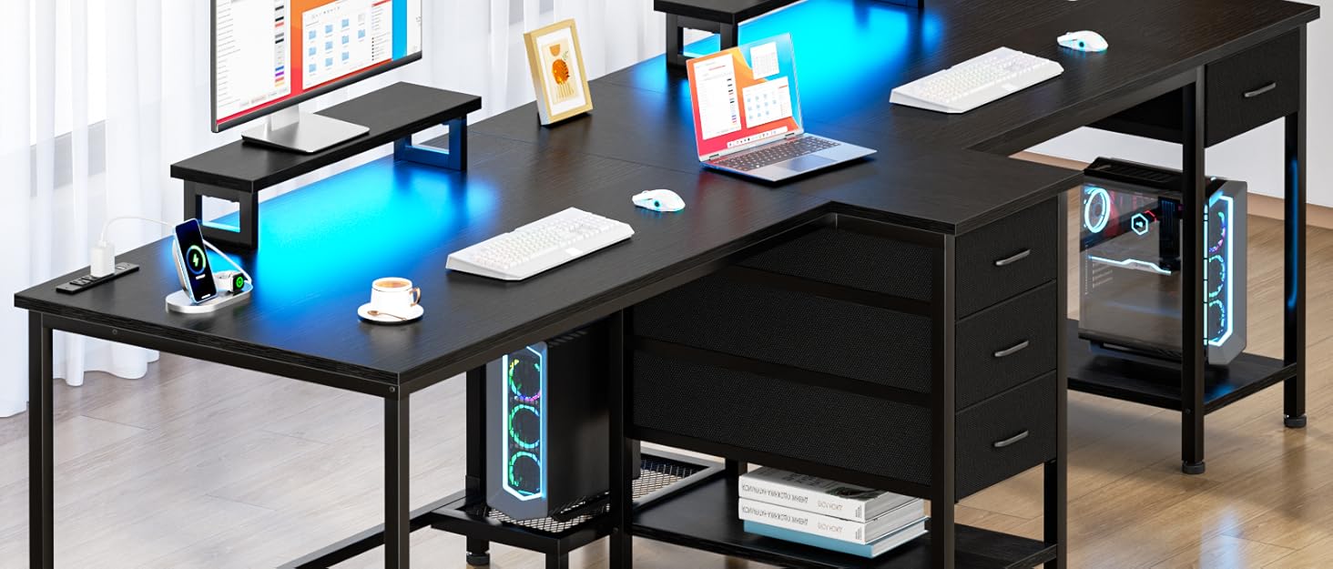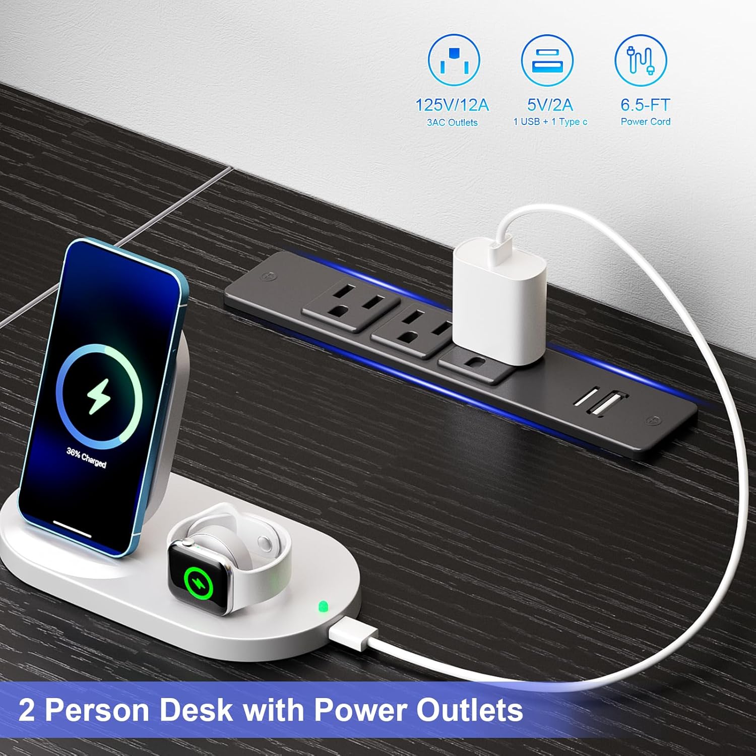93 Inch 2 Person Desk with Power Outlet & LED Light, Extra Long Double Desk with 2 Monitor Stands, Large Home Office Desk for Two People with 4 Adjustable Storage Drawers, Black