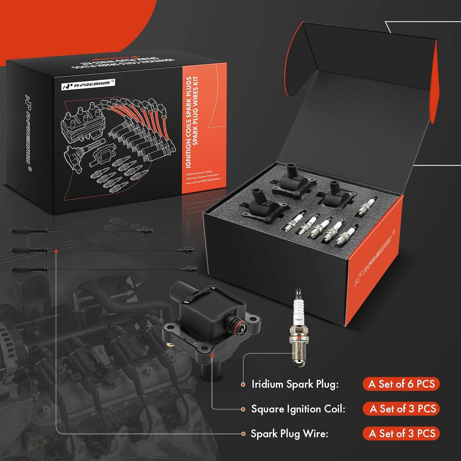 A-Premium 3 Ignition Coil with 3 Spark Plug Wire and 6 Iridium Spark Plug Compatible with Mercedes-Benz C280 1994-1996, C36 AMG 1995-1996, E320 1994-1995, S320/SL320 1994-1996, 300CE/300E/300TE 1993