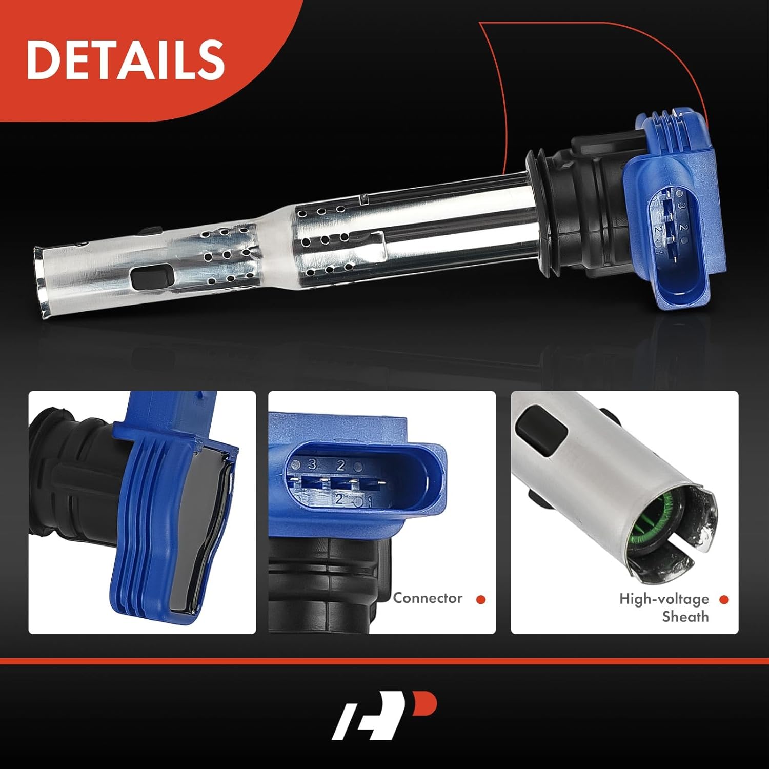 A-Premium (Blue) Engine Ignition Coil Pack Compatible with Volkswagen Jetta, Passat, Golf, Tiguan, Beetle, CC, Eos, GTI, Golf R, Passat CC, Tiguan Limited & Audi A4, Q5, A5 & Lamborghini, 4-PC Set