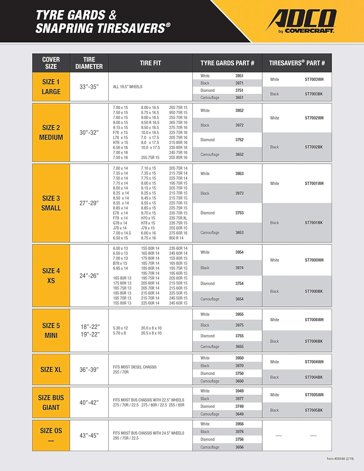 Protect your stored vehicle's tires from the environment with these durable wheel covers by ADCO, featuring Diamond Plated Vinyl Design . Tires left exposed to the sun and other environmental hazards will deteriorate much faster than you might think and could potentially lead to on-road blowouts as well as costly replacement. ADCO's Tyre Gard's are a cost effective way to prolong the life of your tires and reduce expenses long term. To order the best fitting cover for your tires, you will need your tire's overall diameter (including rim and rubber).