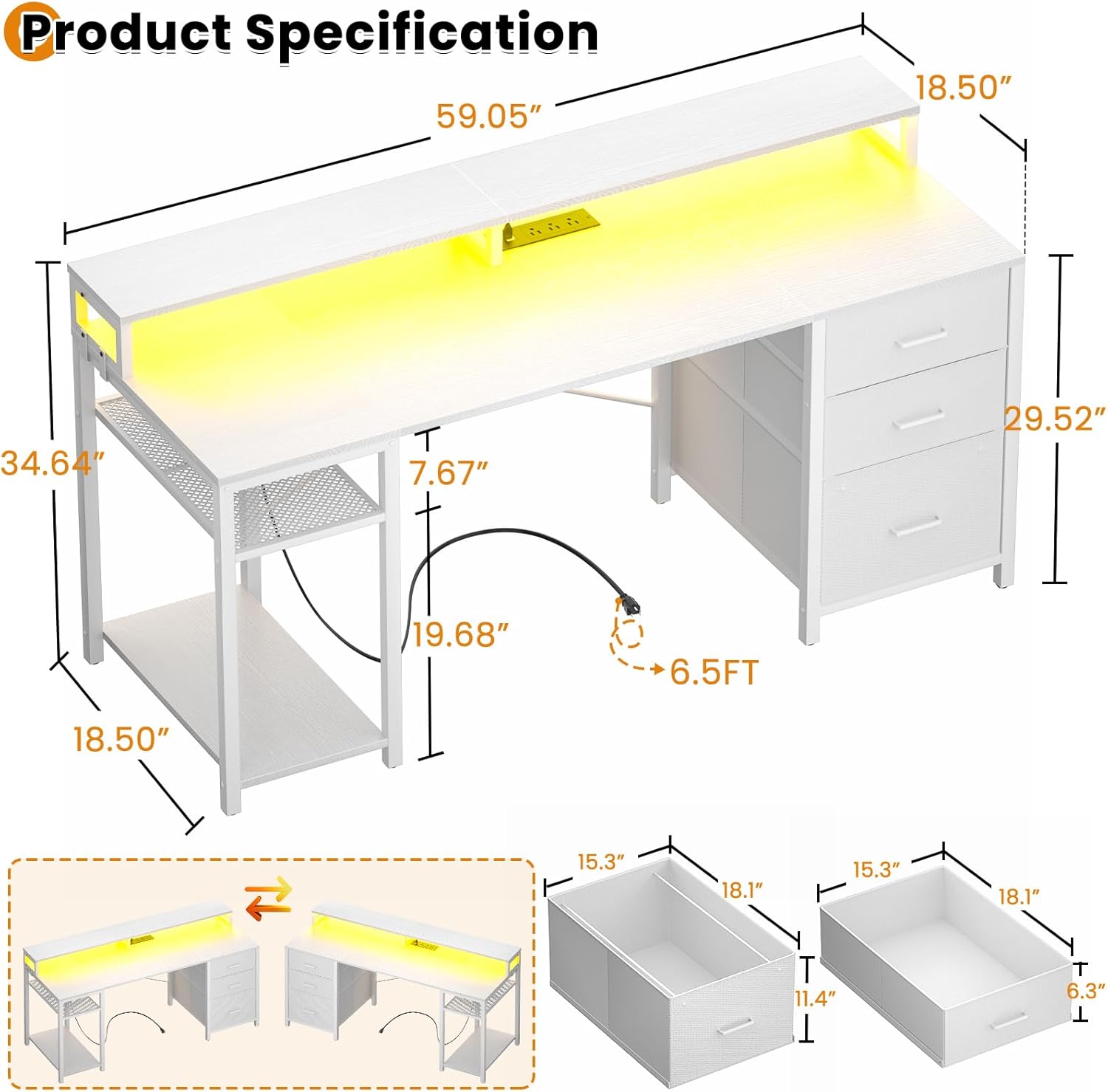 Aheaplus Gaming Desk with LED Lights and Power Outlets, 59 inch Computer Desk with Fabric File Drawers, Home Office Desk with Monitor Stand and Storage Shelves, White