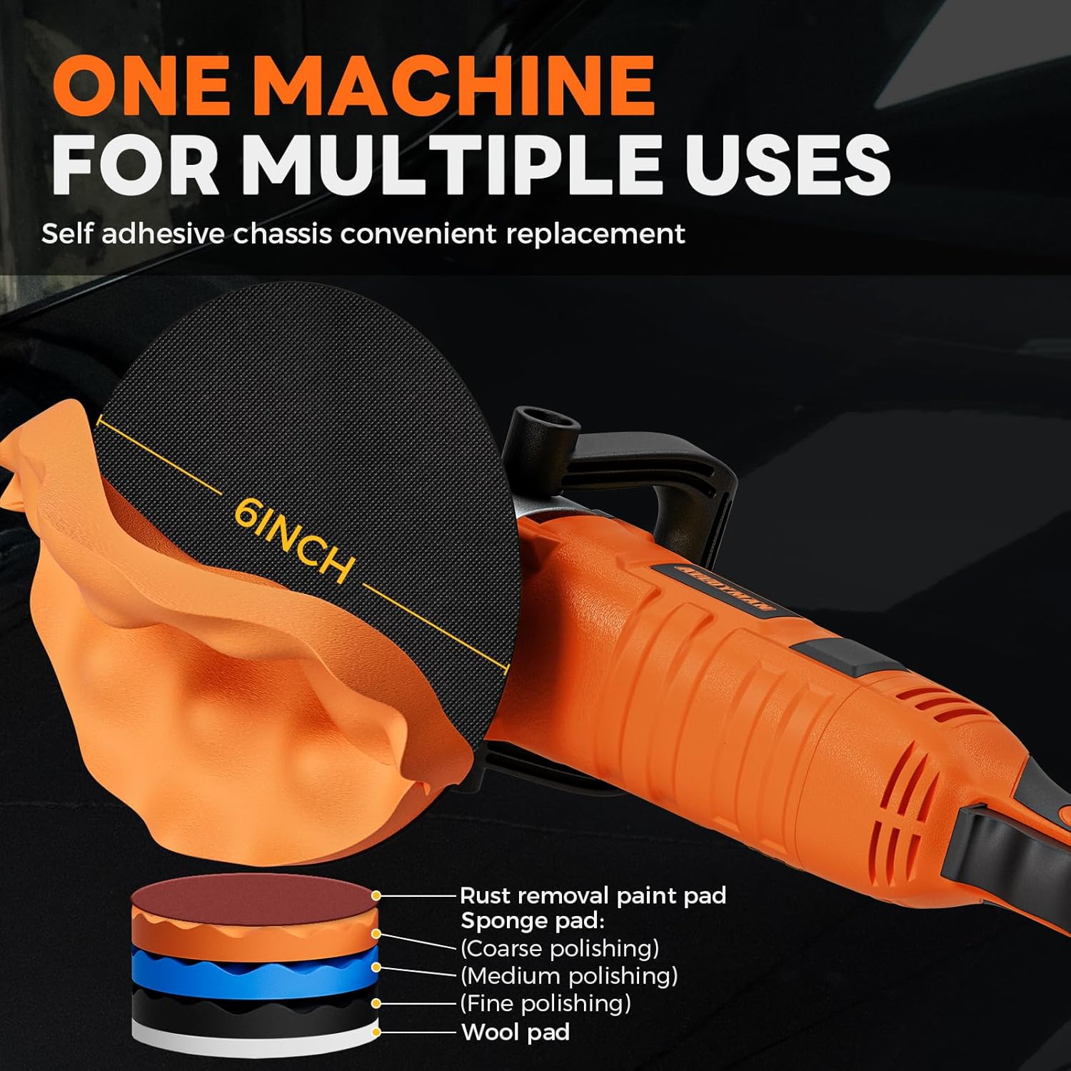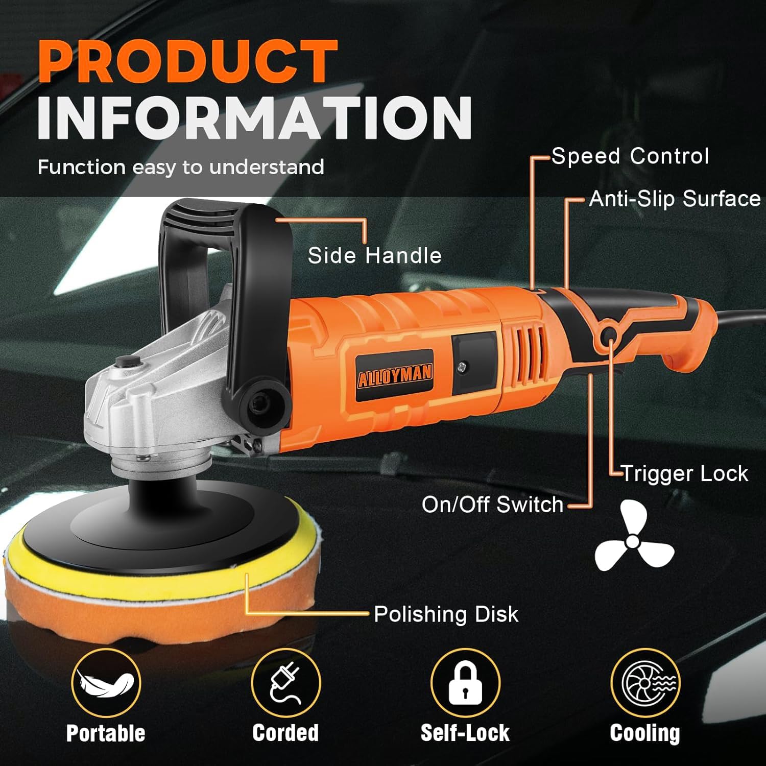 Alloyman Buffer Polisher, 1200W 7 Inch/6 Inch Car Polisher Set, 7 Variable Speed 600-3000 RPM, Car Polishers and Buffers with Detachable Handle for Car, Boat Sanding, Polishing, Waxing