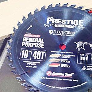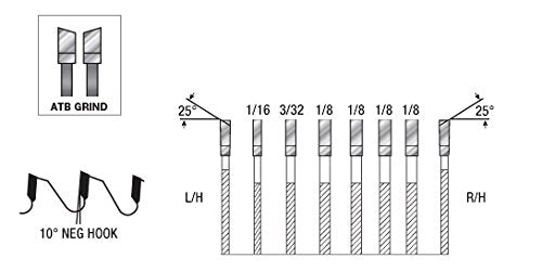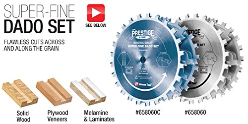 Our Prestige dado set cuts perfectly smooth edges, flat-bottom cuts and grooves both along and across the grain that are free of splinters or rough edges. This dado set is part of the renowned “prestige” line of superior performance blades.Like all of the blades in our Prestige lineup, This super-smooth cutting prestige dado set features the latest in cutting tool technology including massive tool-steel plates and precision ground d-10 carbide teeth. The 8" Diameter, 24-Tooth outside plates are hollow ground for proper clearance and feature high ATB grind geometry with every sixth tooth Flat ground for efficient chip removal. Each tooth body also features anti-kickback design to help prevent overfeeding, #658060C, (D) diameter: 8 (200mm), teeth: 24, (D) bore: 5/8, tooth grind: Hi-ATB, hook angle: -10°, ATB angle: 25°, kerf (B): 1/4 to 29/32, Description: (6) 4-Wing Chippers, 658060C carbide Tipped electro-blue prestige dado 8 inch dia X 24T Hi-ATB, 5/8 Bore, complete dado set with six 4-Wing Chippers