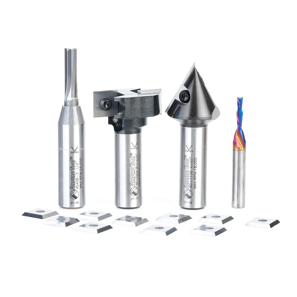 CNC Router Bit Collections are made by Amana Tool, the leading manufacturers of cutting tools. Amana Tool AMS-177-K 8-Pc CNC Router Bit Collection feat. V-Grooves, Point Roundover and Multi-Purpose Spektra Bits, 1/4 Shank is designed for CNC profiling, 2D and 3D profiling, and carving in plastics, aluminum, and wood. Also perfect for signmaking. Each router bit is manufactured from Amana Tools exclusive grade carbide according to stringent quality standards. Excellent for: Composite, Fiberglass, Fiberglass PCB Board, Graphite, MDF/HDF, Phenolic Composites, Plastic, PVC & Acrylic, Plexiglass, Sign Foam, Sign Board & HDU, Wood, Durabond. Set #AMS-177-K Includes the Following Tools: 45704, 45705, 46376-K, 46102-K, 46282-K, 56125, 46202-K, 46200-K.