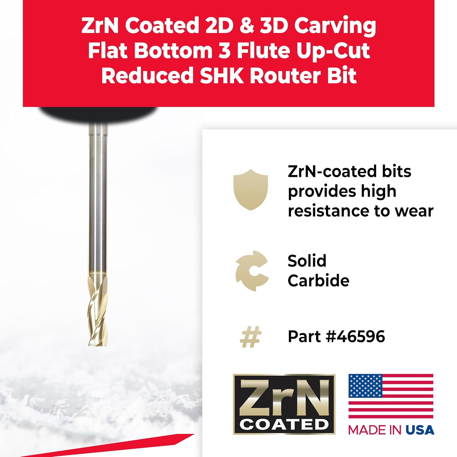 Achieve professional results with our ZrN-coated CNC carving bits, engineered for precision. The ZrN coating enhances cutting performance by creating a harder, tougher edge, extending tool life, and providing resistance to wear. Its advanced design minimizes material buildup in the flutes during cutting, reducing friction and heat while maintaining a sharp edge. These router bits are ideal for detailed work, delivering clean, precise cuts in a variety of materials. The optimized flute geometry and low Total Indicated Runout (TIR) virtually eliminate chatter and the need for sanding. High flute volume supports faster feed rates and chip loads, with a high aspect ratio, these bits are ideal for single-pass deep-reach cutting. PVD ceramic hardcoat technology ensures maximum performance with soft, gummy and abrasive materials.