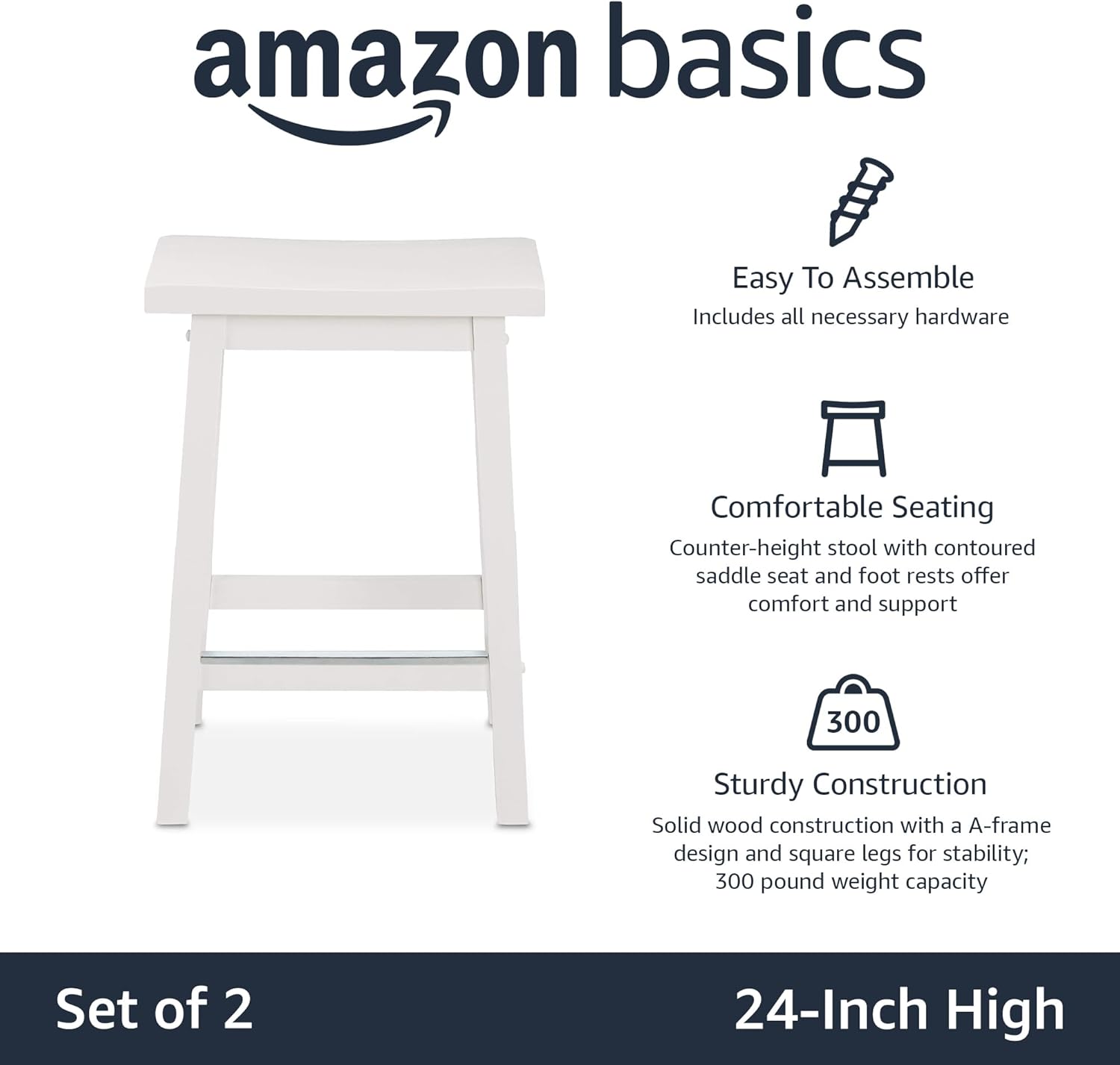 Amazon Basics Solid Wood Saddle-Seat Kitchen Counter-Height Stool - Set of 2, 24 Inch, White