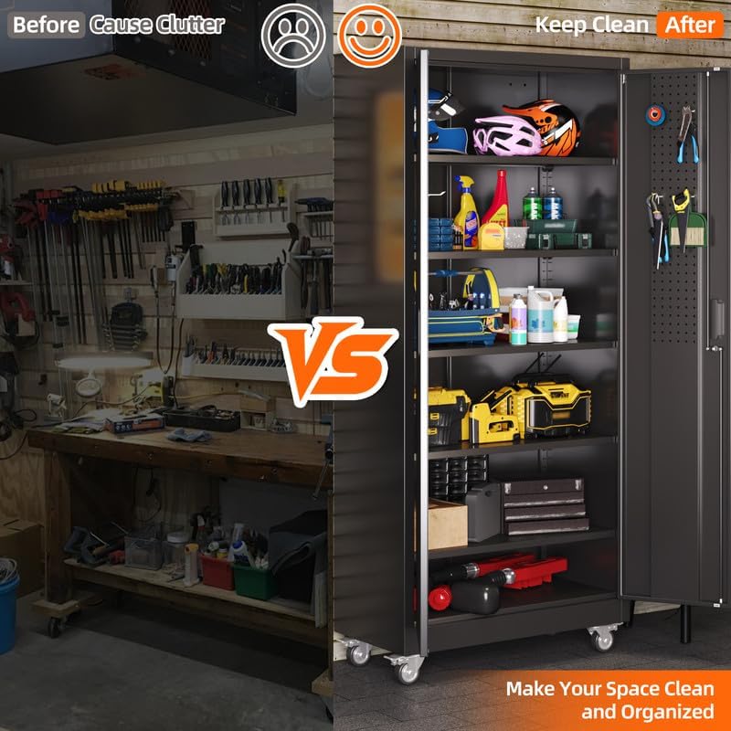 Aobabo Garage Storage Cabinet with Door Pegboard,Lockable Metal Storage Cabinet with 5 Adjustable Shelves for Garage Home,Required Assembly,Black