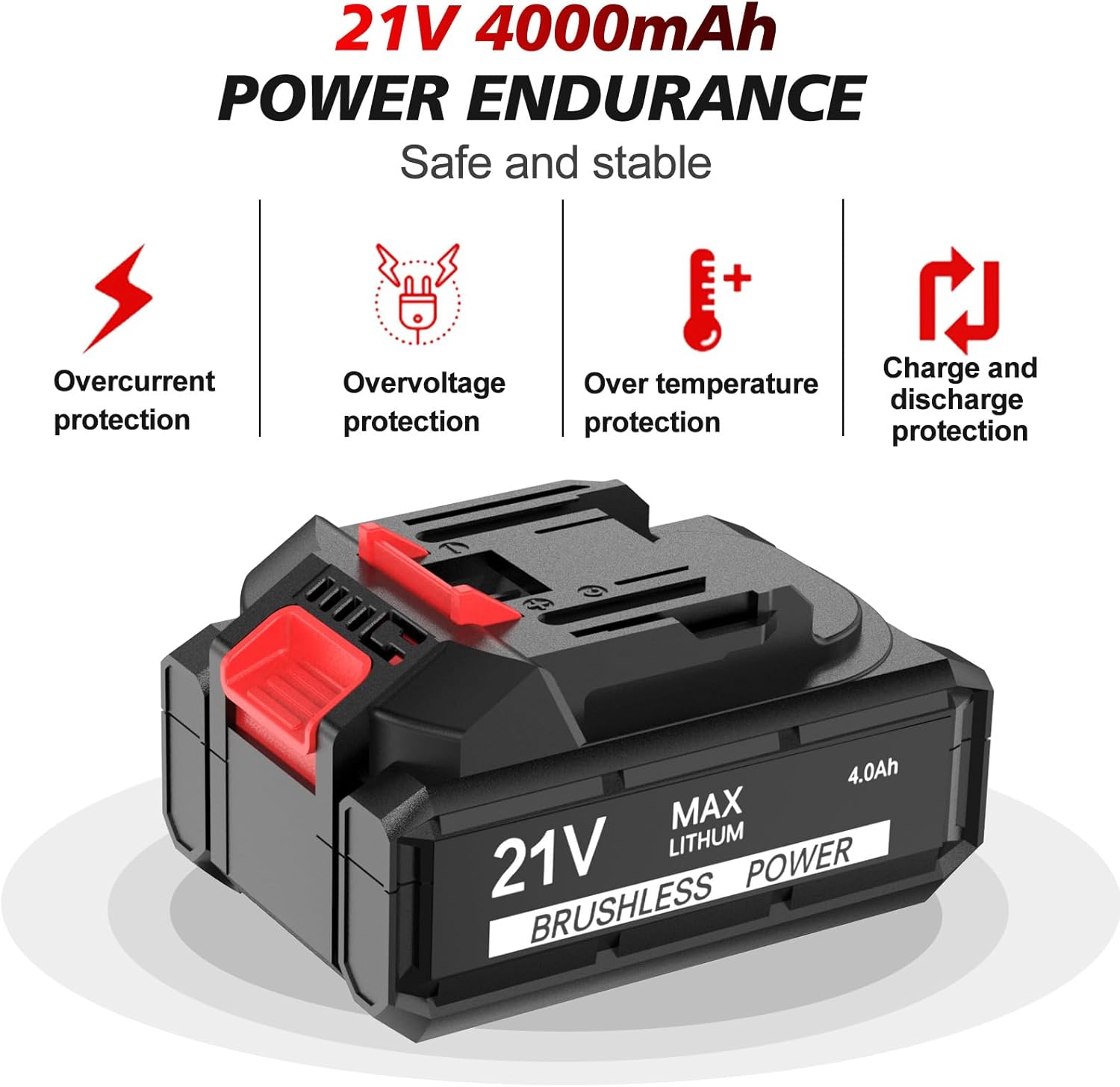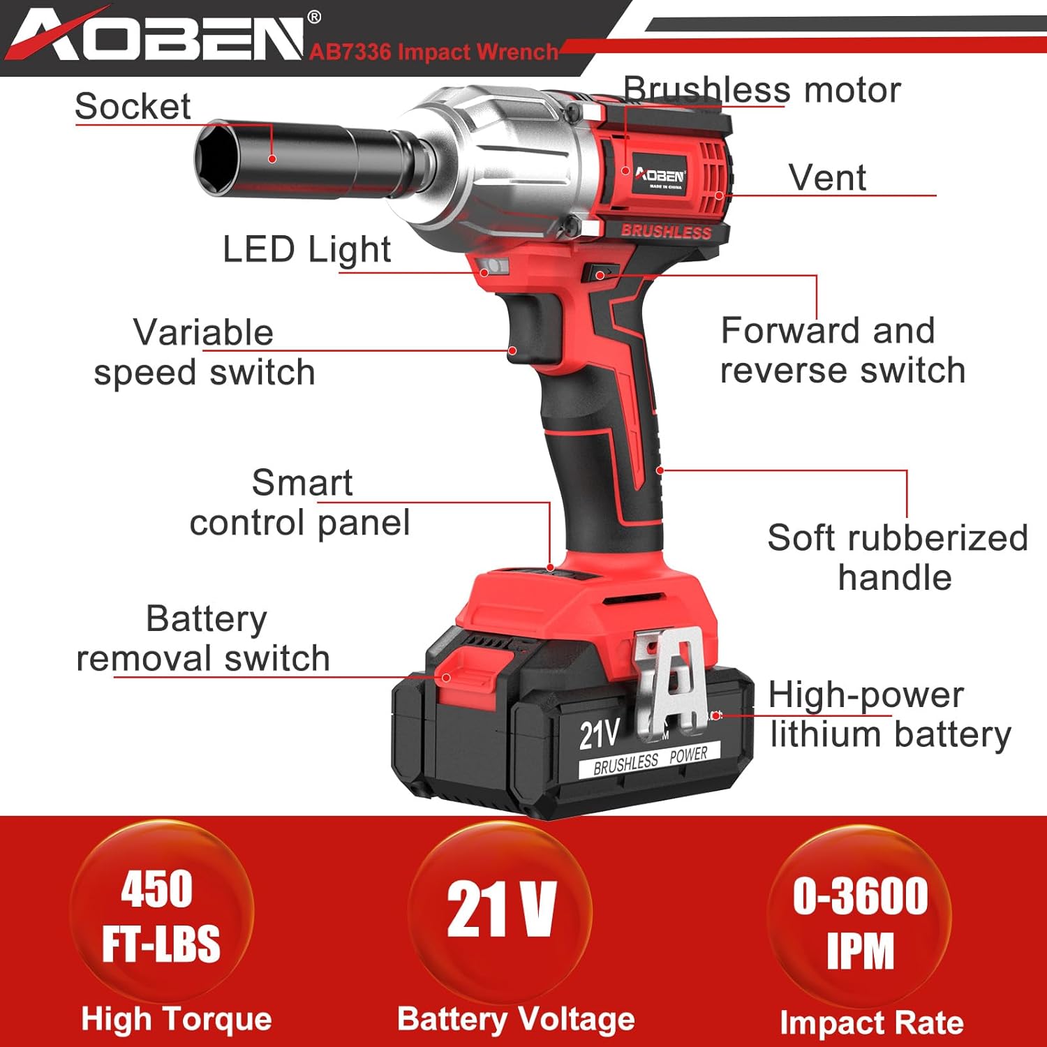 AOBEN 21V Cordless High Torque Impact Wrench 1/2 inch, Powerful Brushless Motor with Max Torque 450 ft-lb (600N.m), 4.0Ah Battery, 6 PCS Sockets (17-22mm), Fast Charger and Tool Box