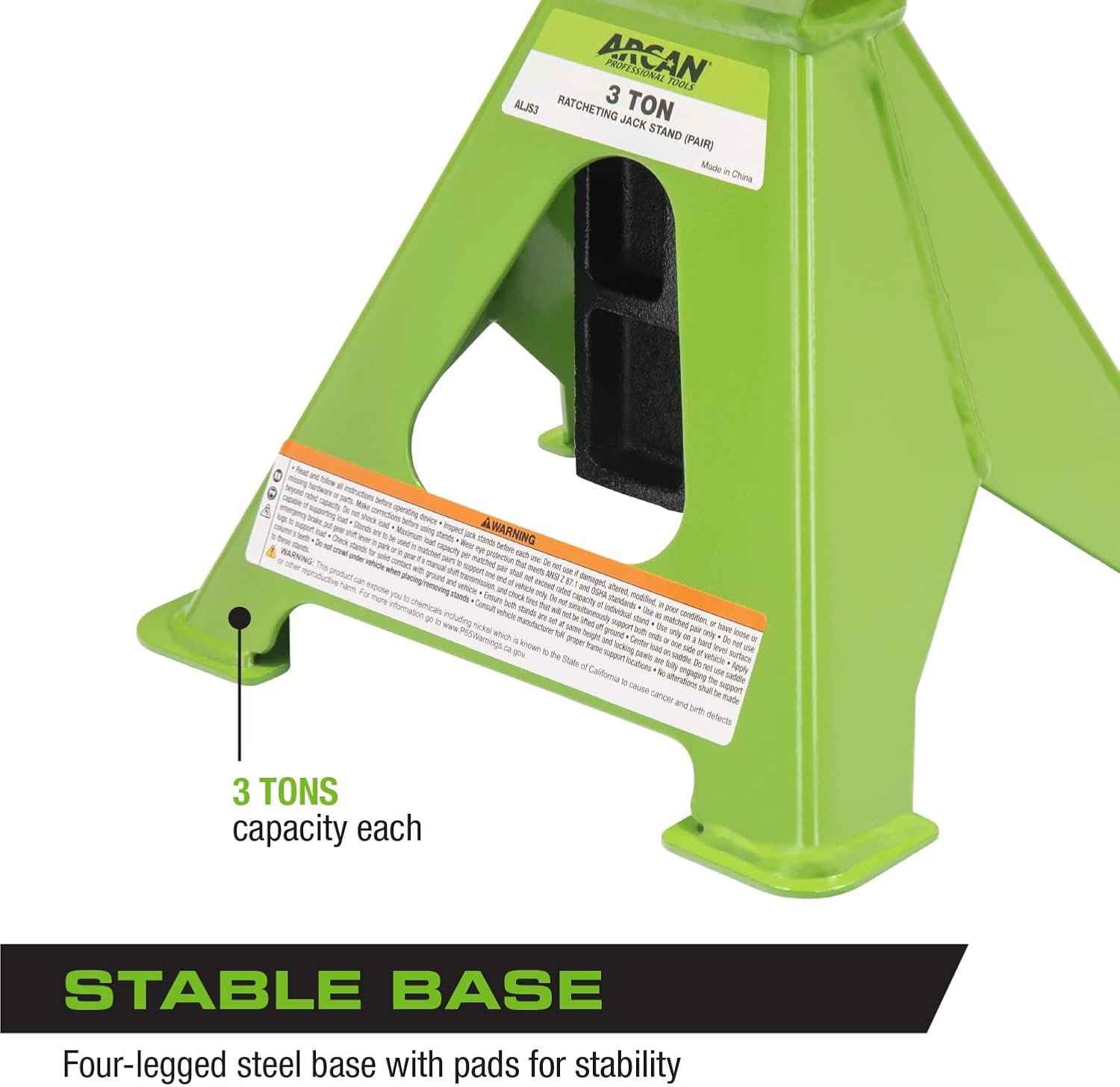 The Arcana ALJS3 3 Ton Steel Jack Stands has an overall 3 ton lifting capacity and a working range of 11-5/8" to 17. 5". A counterweighted pawl locks in place securely to prevent slipping, while allowing easy adjustments. A large contoured saddle with locating lugs helps support and position vehicle frame. The wide stance base delivers superior stability and includes base pads that prevents the jack from sinking into asphalt and provide stable footing for the jack stands. The welded construction and alloyed steel offer years of support. We put all of our lifting equipment through voluntary and rigorous third party safety testing, as outlined by the ASME PASE-2014 Safety Standard for Portable Automotive Service Equipment, to ensure that our products are among the safest on the market.