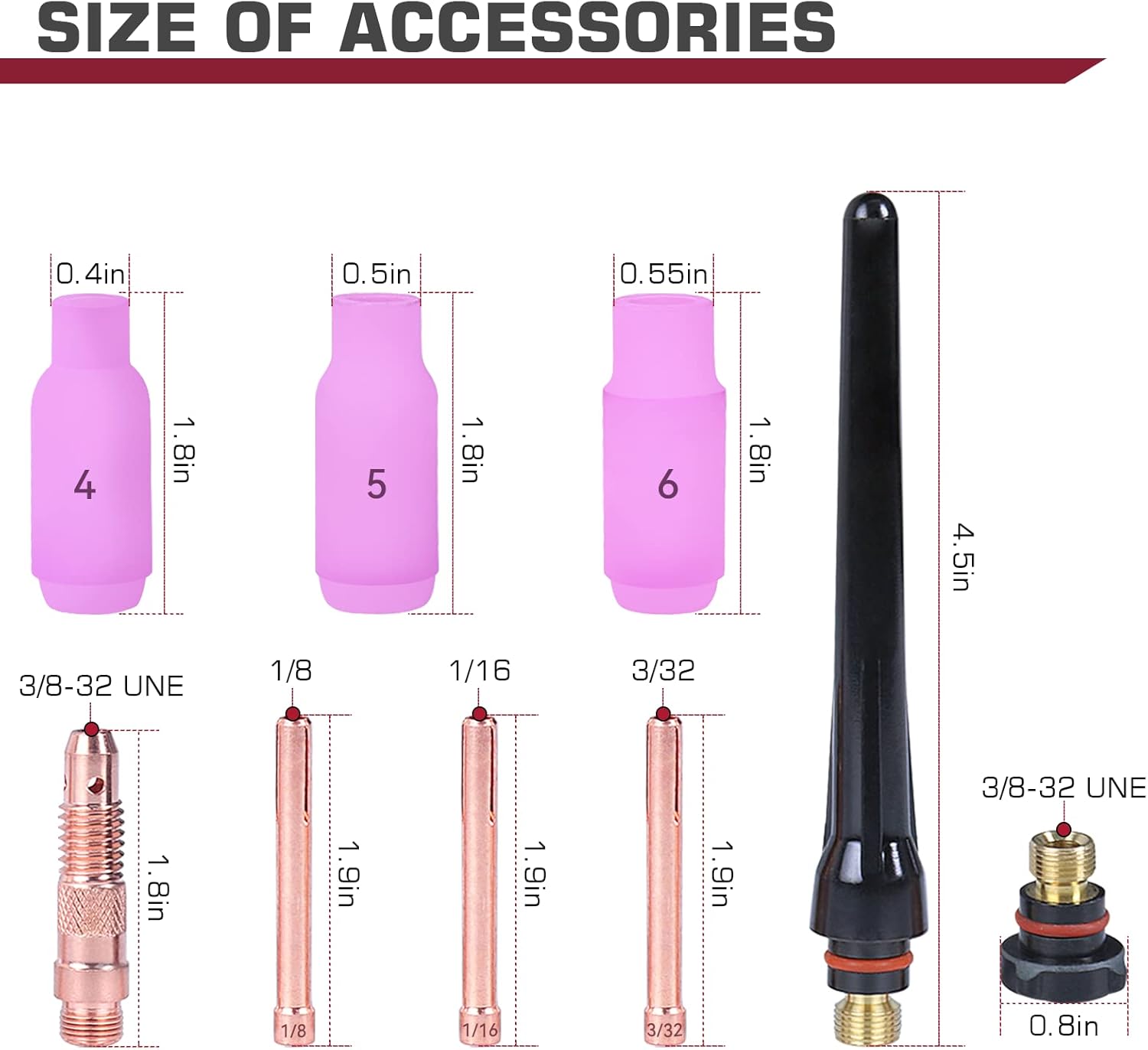 Packing List | 3pcs TIG Alumina Nozzle Ceramic Cup 3pcs TIG Collets(1/16",3/32",1/8") 1pc TIG Collet Bodies 2pc TIG Back Cap |