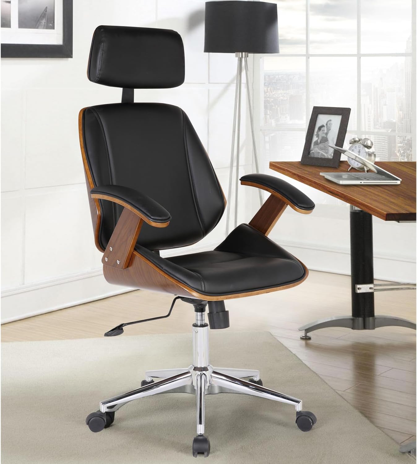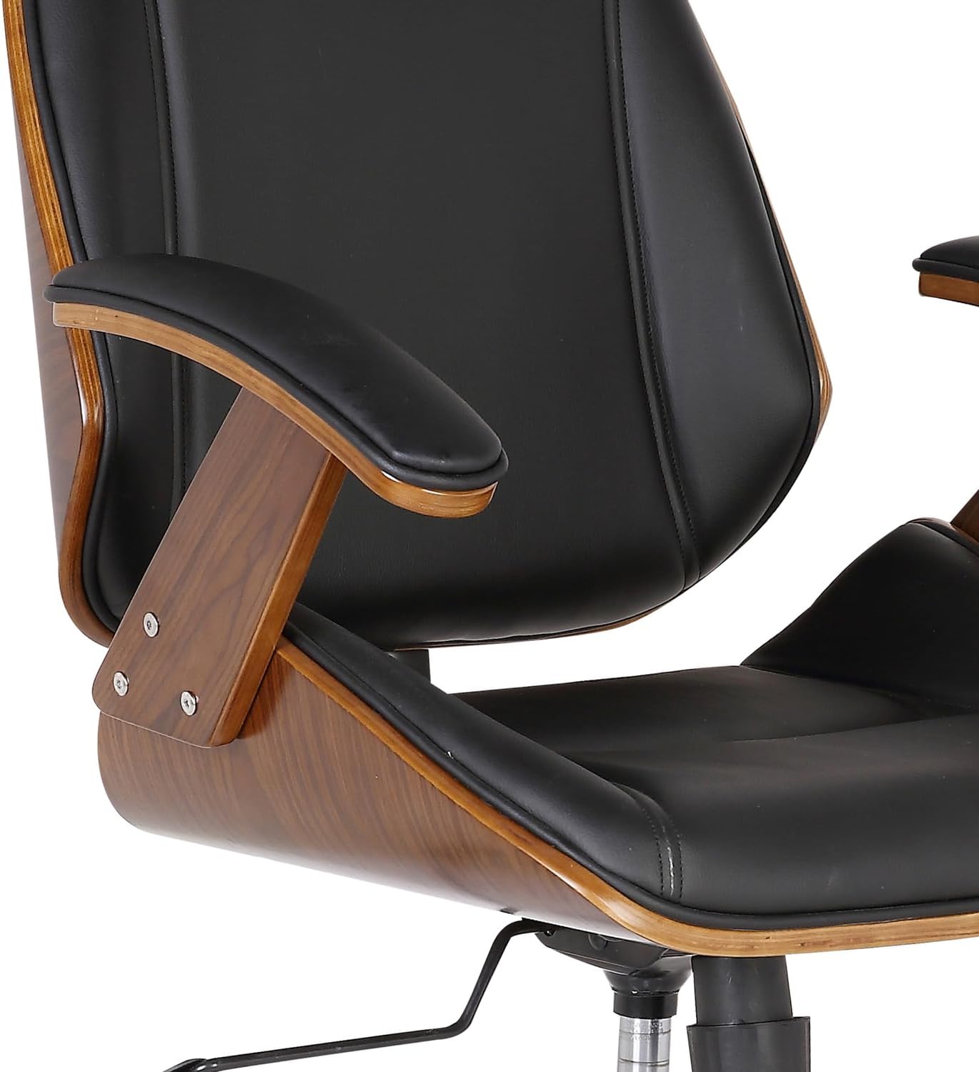 Armen Living Century Office Chair in Black Faux Leather and Walnut Wood, Chrome Finish