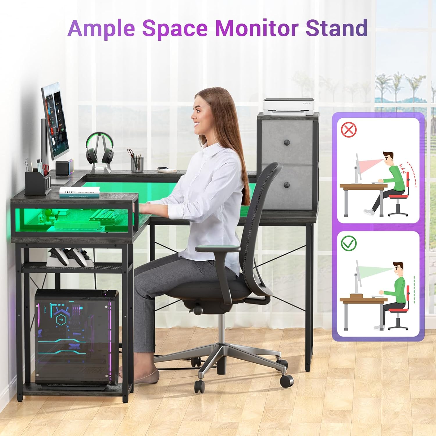armocity L Shaped Desk with Drawers, Reversible Corner Computer Desk with LED Light & Power Outlet, 55.2'' L-Shaped Gaming Desk with Long Monitor Shelf, Home Office Desk for Small Corner Space, Grey