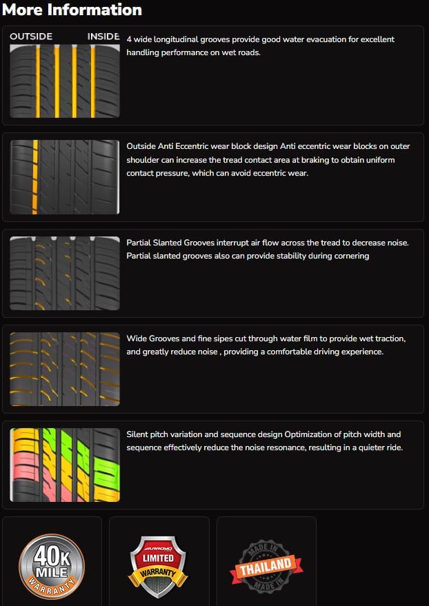 Arroyo Grand Sport A/S. All Season performance, Assymetrical design for more contact and, cornering capability, Urgent steering response and grip, Design to work for all seasons. The 4 wide longitudinal grooves provide good drainage performance, keep excellent handling performance in wet road. The Anti eccentric wear belts on outer shoulder can increase the tread contact area at braking to obtain uniform contract pressure, which can avoid the eccentric wear. The Closed slanted grooves can disturb the spread direction of noise to decrease noise. Closed slanted grooves also can provide stability during cornering. The Wide Grooves and fine sipes design can destroy water film to guarantee the drainage performance effectively , and reduce noise greatly, providing a comfortable driving experience. The Silent pitch and sequence design for optimization of pitch width and sequence effectively reduce the noise resonance, resulting in a quieter ride.