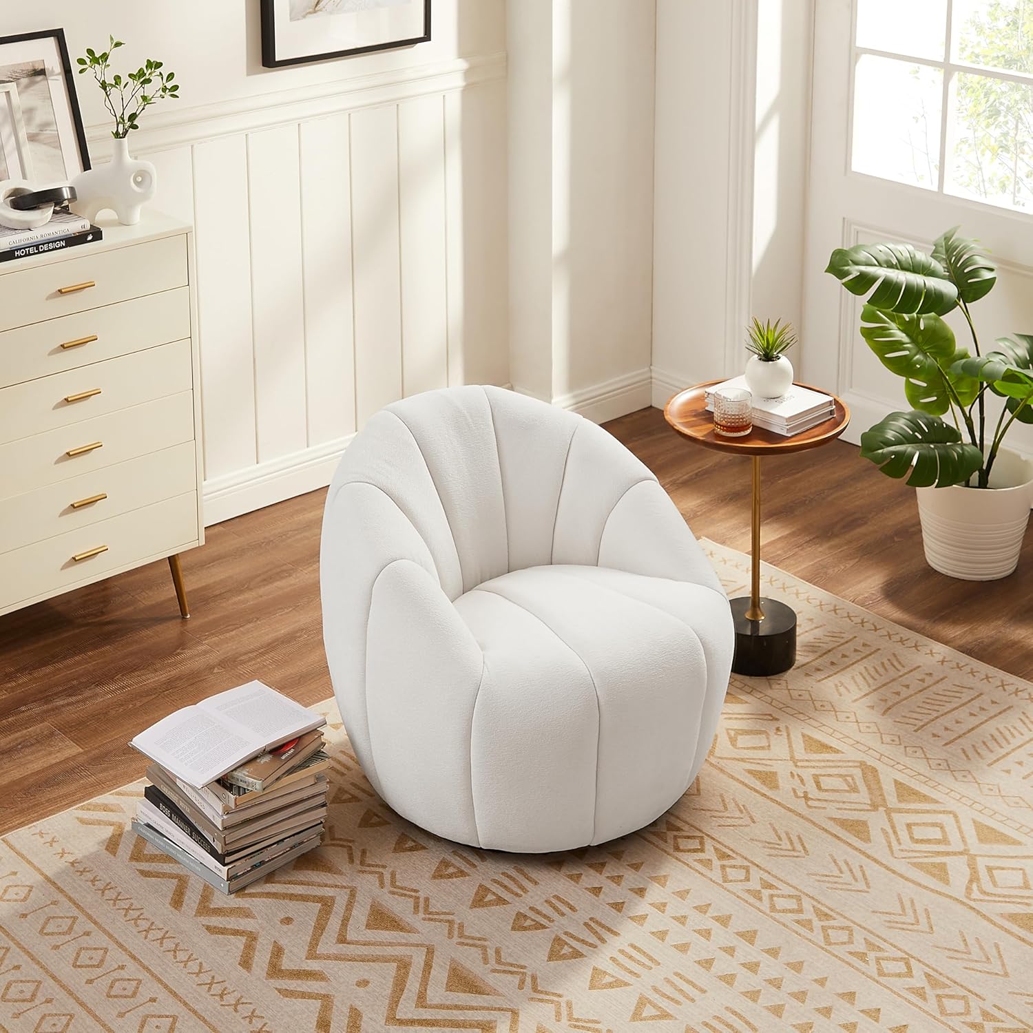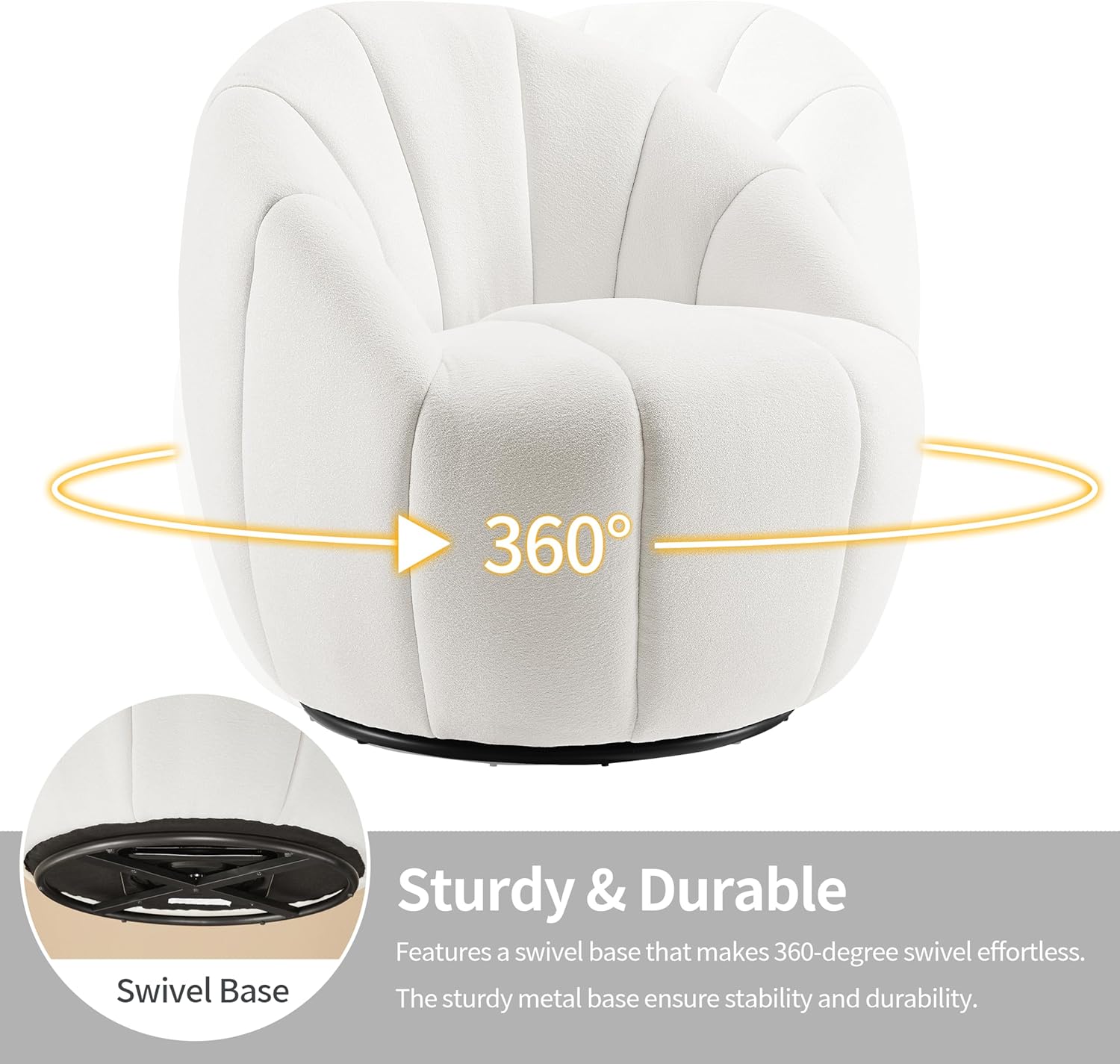 Art Leon Swivel Accent Chair, Modern Fabric Upholstered Barrel Chair, Round Comfy Armchair with Metal Base for Living Room Bedroom, Off White