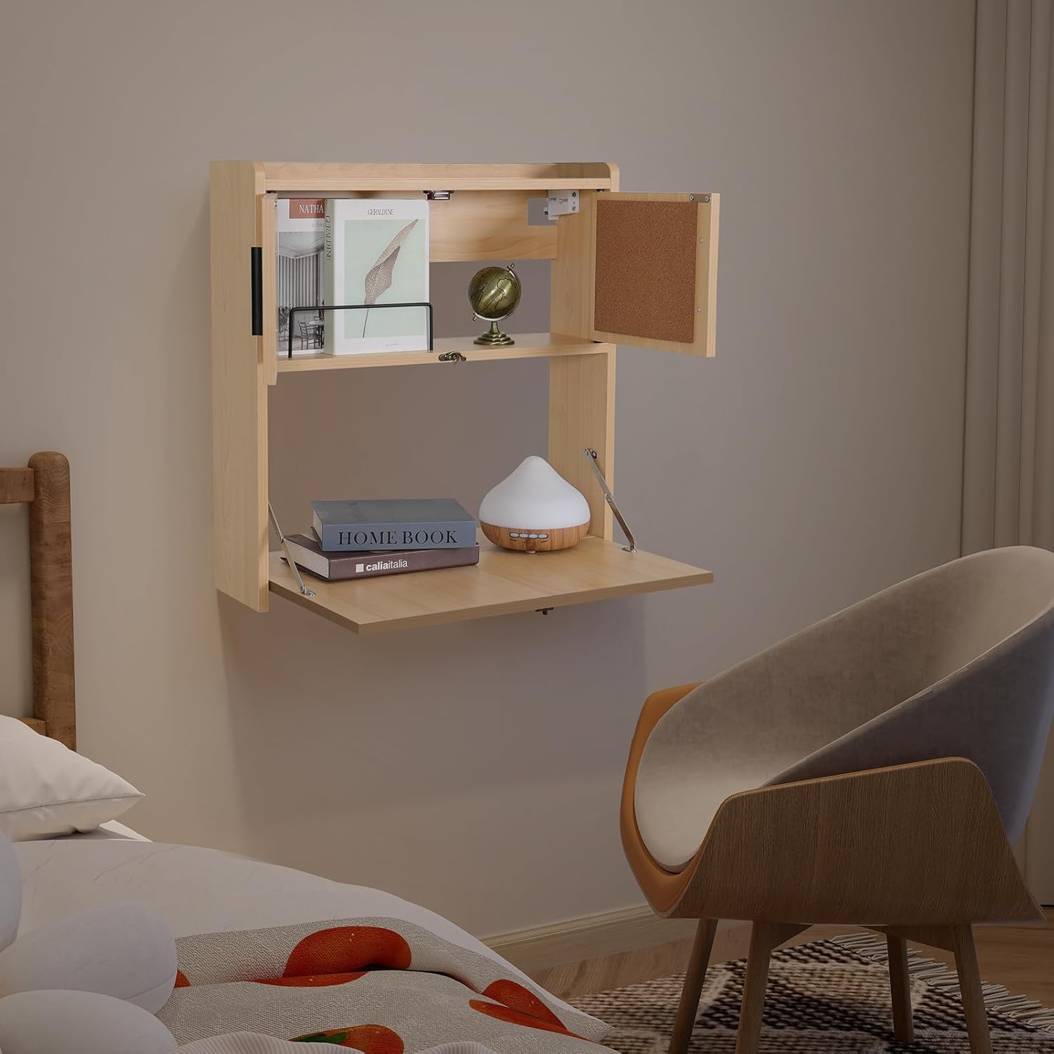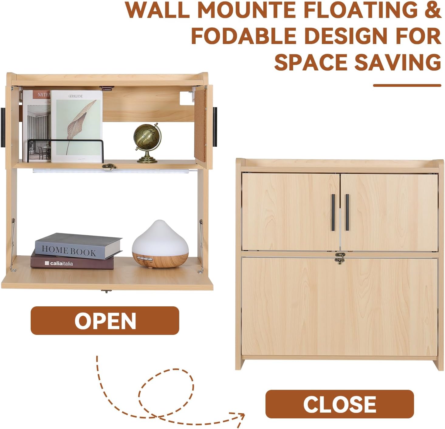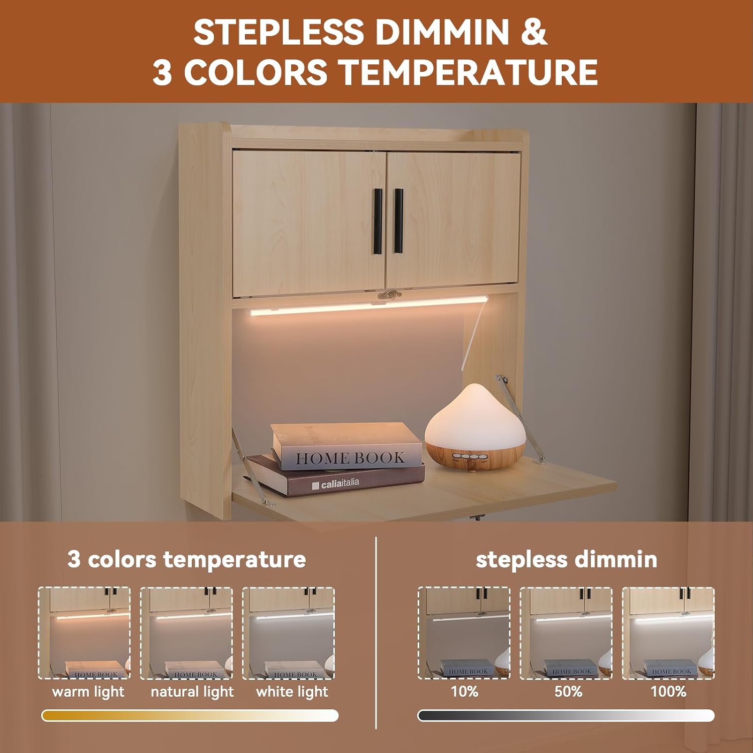ARTETHYS Wall Mounted Desk with LED Light Multifunctional Fold Down Laptop Computer Table Writing Workstation with Storage Compartments Space Saving for Home Office Wood Color