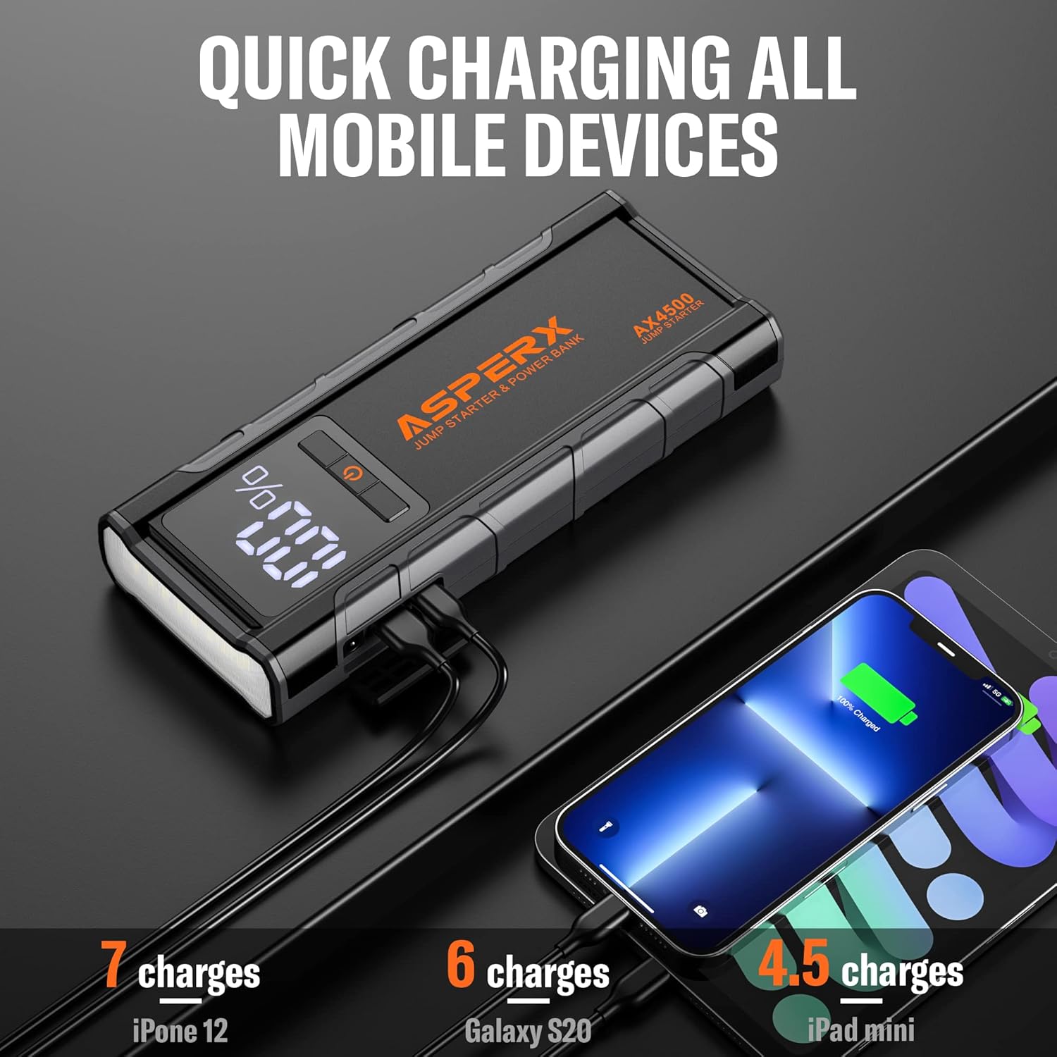 ASPERX AX4500 Jump Starter, 4500A Peak Car Jump Starter for Up to All Gas and 10.0L Diesel Engines, 12V Battery Starter with 4 Inch LCD Display, Lithium Battery Booster with Built-in LED Light