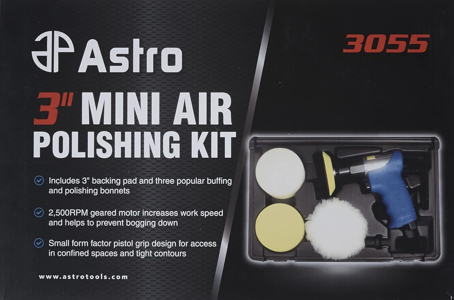The Astro Pneumatic 3055 3-Inch Mini Air Polishing Kit is designed to work on buffing small confined areas where larger tools cannot do the job. This tool will improve the finish on any painted surface as well as stainless steel or aluminum. Range of use includes cabinet shops, woodworking shops, fabrication shops, body shops, detail shops, motorcycle shops, hobbyist, industrial, marine and aviation.