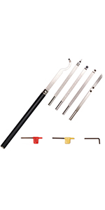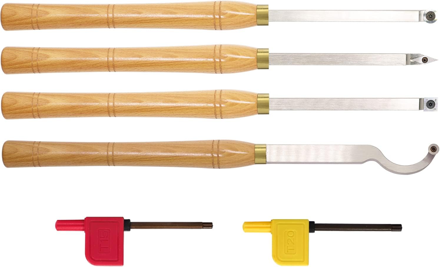 AT04 Carbide Tipped Wood Turning tools Lathe set Rougher Detailer Finisher Swan Neck Hollower with Solid Wood Handle and Diamond Round Square Carbide Inserts 4pcs
