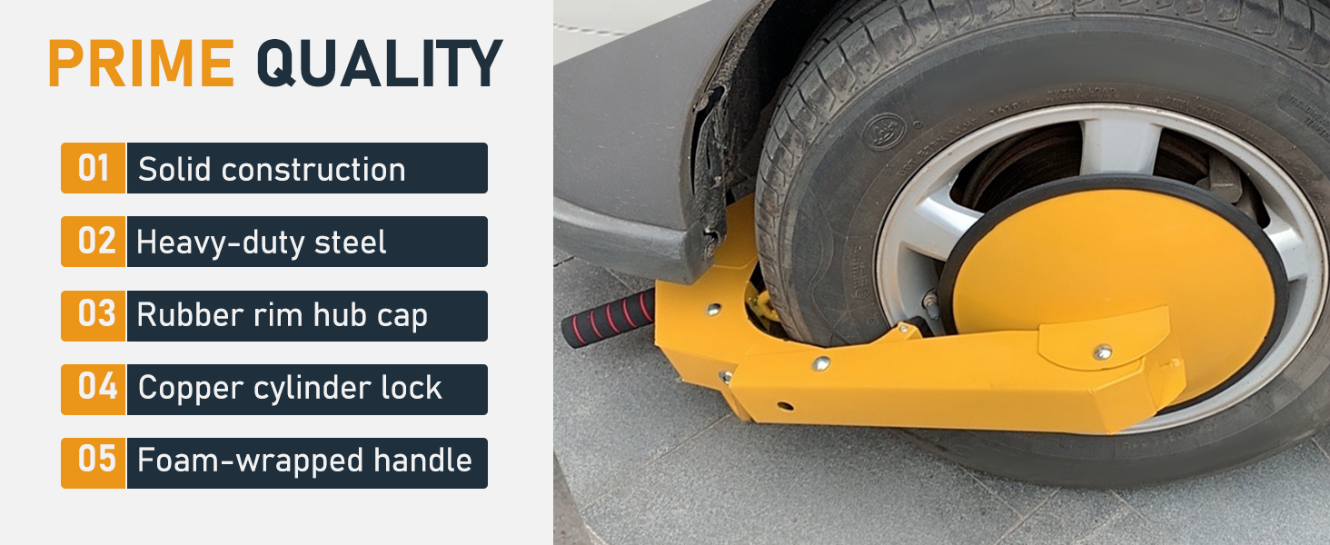 The wheel lock clamp is made of heavy-duty steel that's weather and rust-resistant. It's durable and reusable.