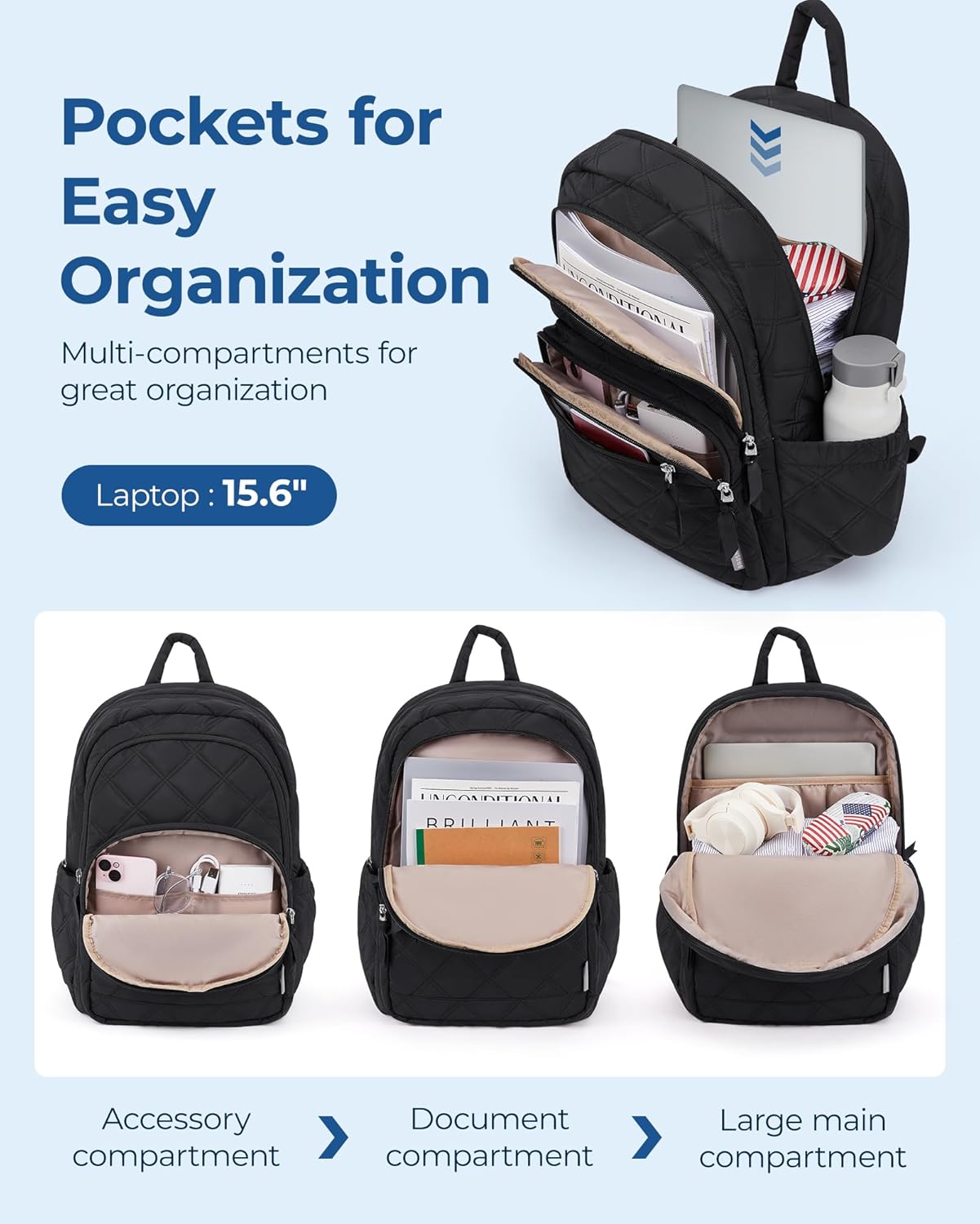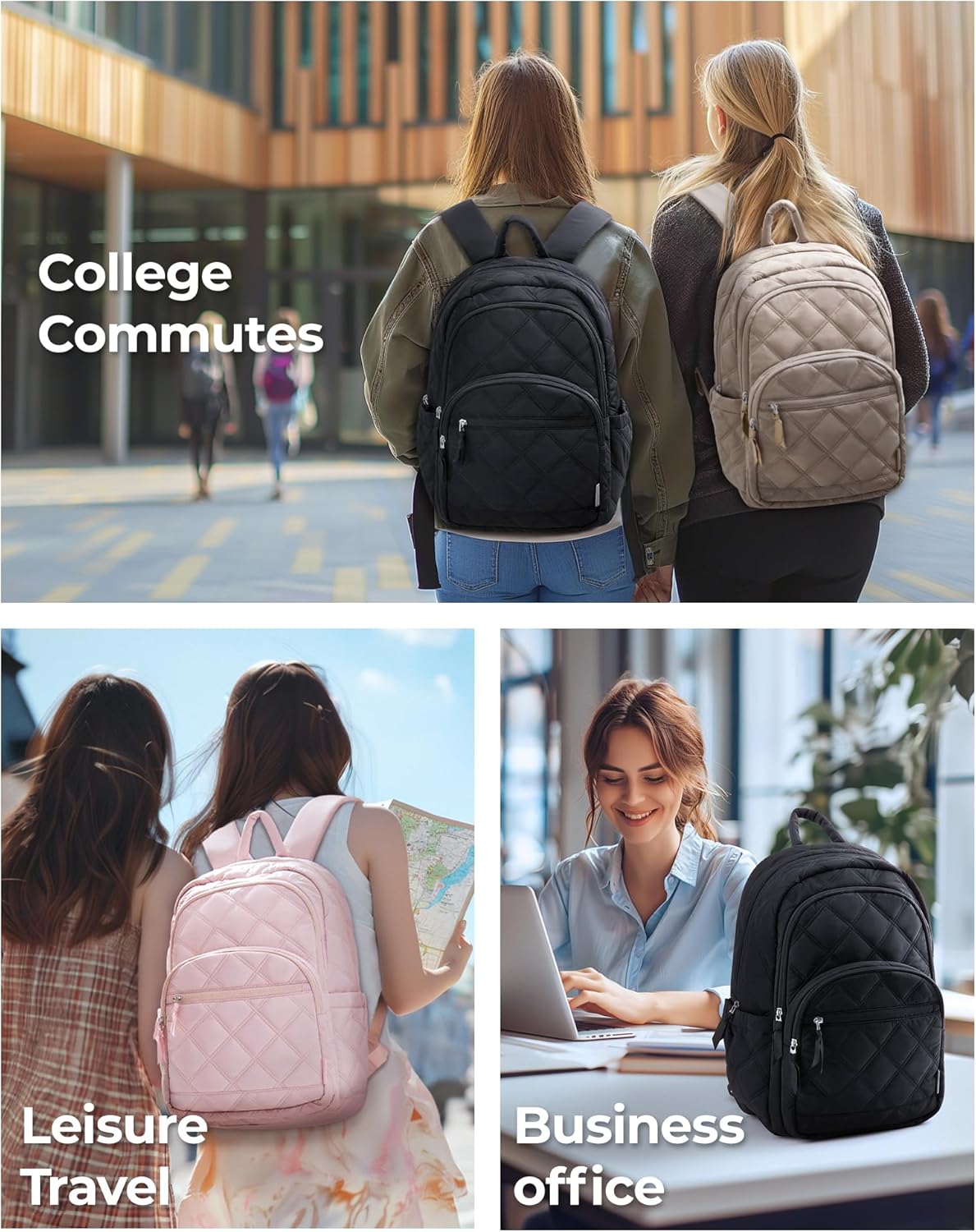 BAGSMART Travel Laptop Backpack, College Backpack for Women, Quilted Small Computer Bookbag, Water-Resistant 15.6 Inch Laptop Casual Bag, Black