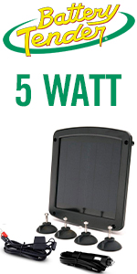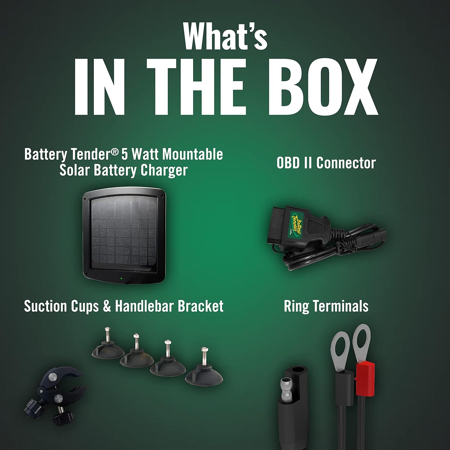 Battery Tender 5 Watt Solar Panel 12V Battery Charger with Charge Controller - IP67 Weatherproof - Windshield or Handlebar Mountable - Included Ring Terminal Cable or OBD II Connector - 021-1172