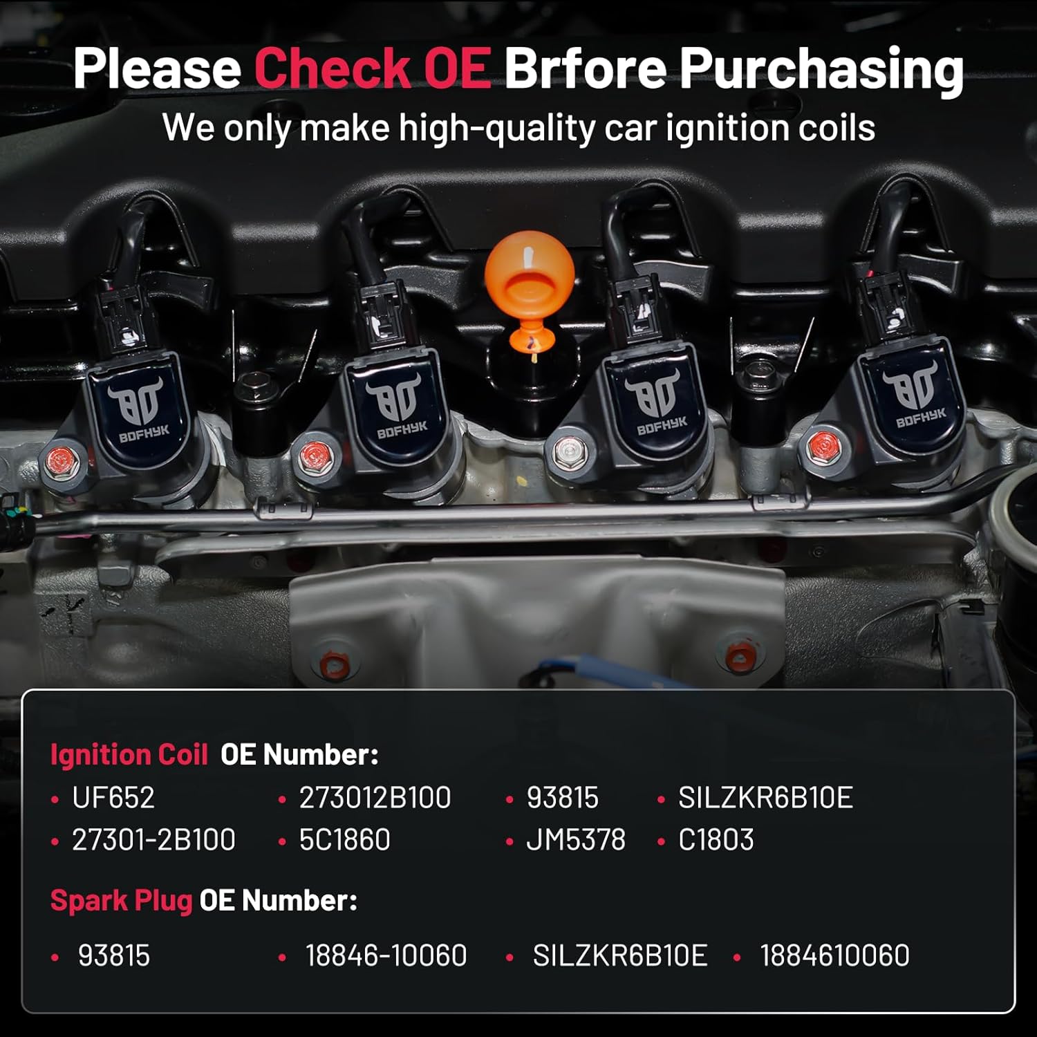 BDFHYK Coil Pack UF652 and Iridium Spark Plugs 93815 Compatible with Hyundai Accent Veloster Kia Rio Soul 1.6L 2.0L L4, Sets of 4