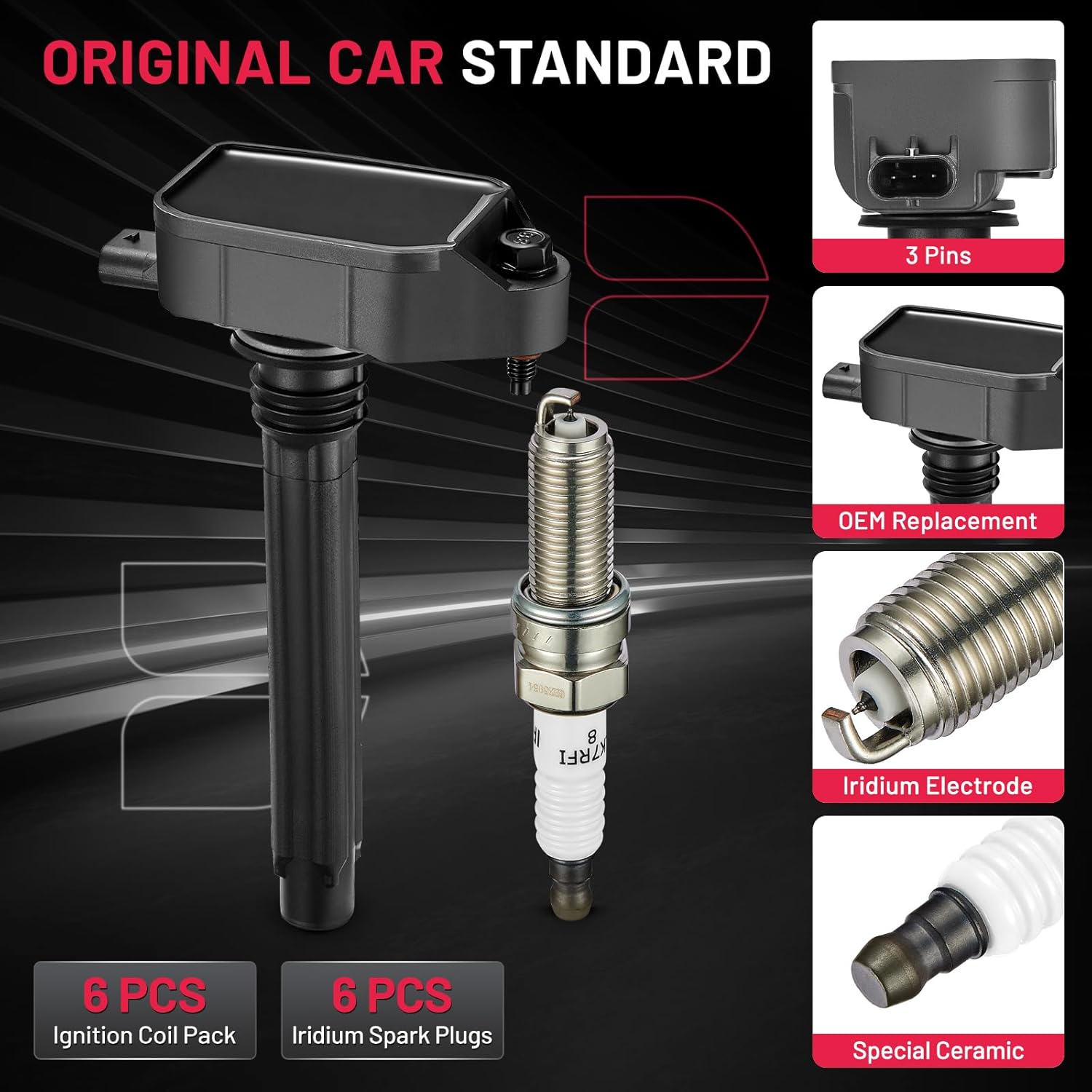 BDFHYK Ignition Coil Pack UF807 and Iridium Spark Plugs 93175 Compatible with Chrysler Pacifica Dodge Durango Jeep Grand Cherokee Wrangler Ram 1500 3.6L V6 68223569AB LKR7DIX-11S, Sets of 6