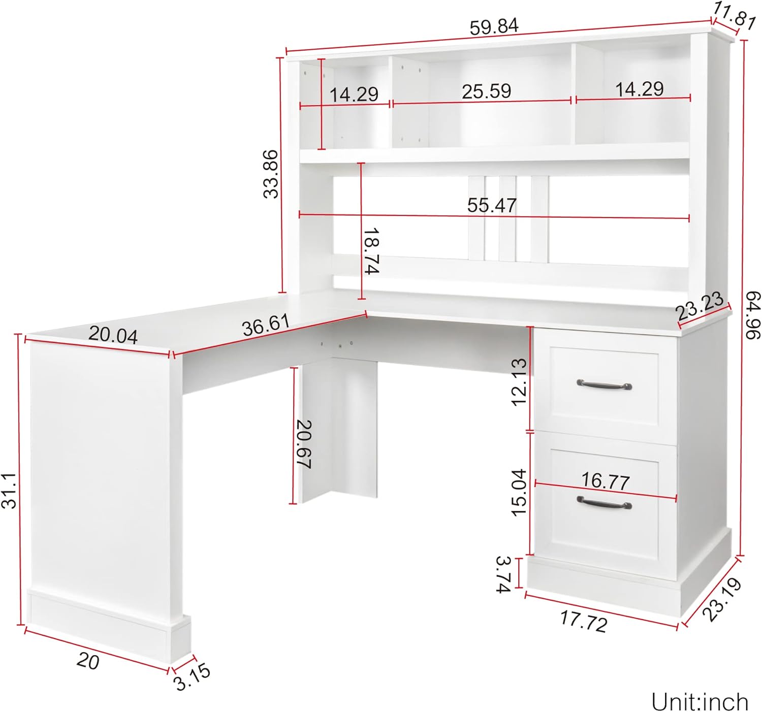 Welcome to shopping with us. Your satisfaction is our greatest motivation. If you have any problems, Please feel free to contact us. We will try our best to make you satisfied. L-Shaped Office Desk, 2-Tier Open Shelf and 2 Large Drawers Home Desk, Computer Desk with Hutch, Corner Desk with Kitchen Cabinet Specification Product Type: L Shaped Desk Color: Antiqued White Detail Product Dimension: Please refer to the Size image Product material: MDF Level of Assembly: Full Assembly Needed Additional Tools Required: All Tools Included Weight & Dimensions Overall Product Dimension: 59.84 * 59.84 * 64.96 inches Overall Product Weight: 165.35 lbs Weight Capacity: 110LBS Numbers of package: 2 Package Dimension: Package 1: 36.42 * 24.41 * 7.28 inches 79.37 lbs Package 2: 63 * 25.59 * 4.92 inches 94.8 lbs