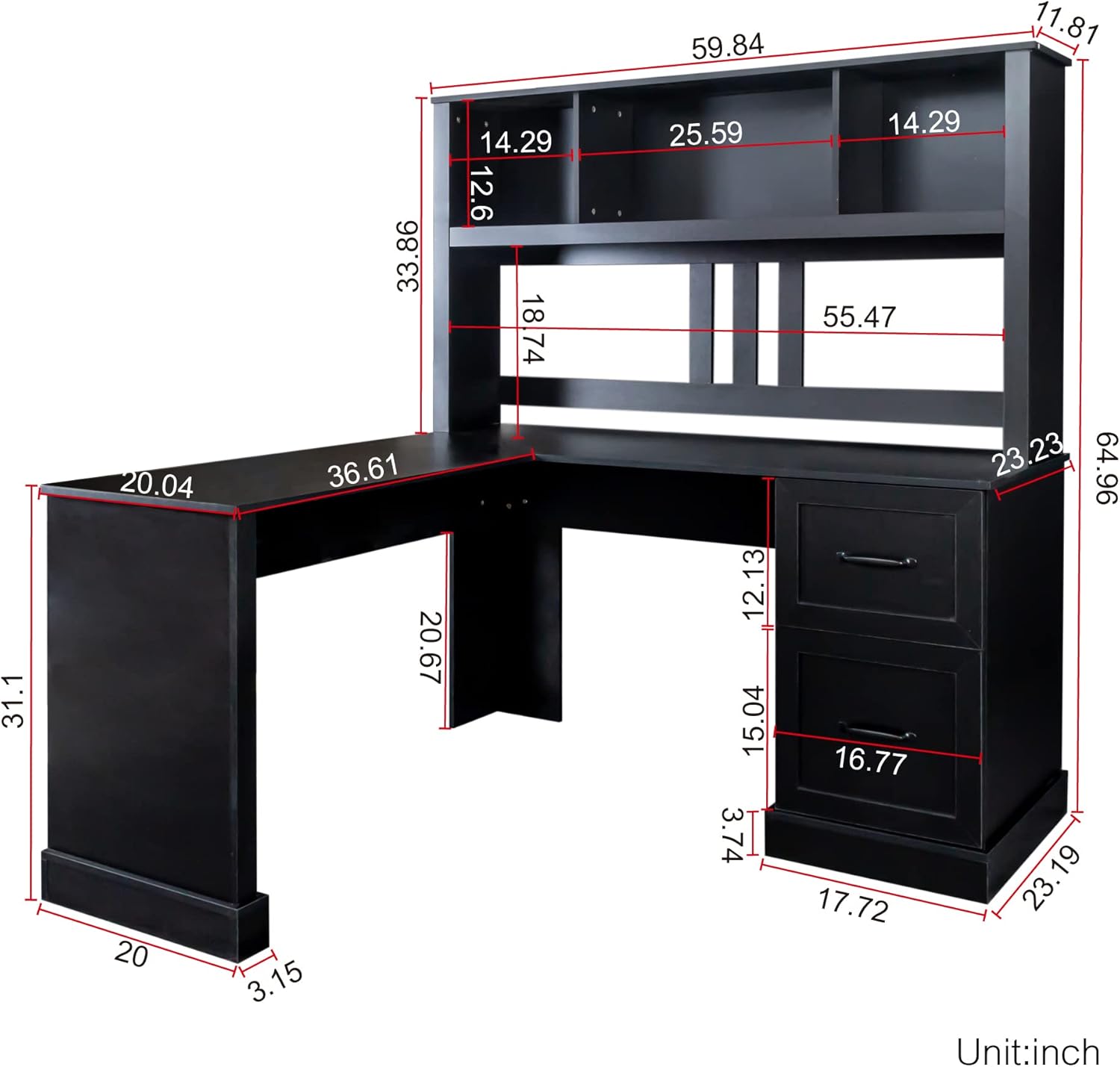 Bellemave L Shaped Desk with Hutch Wood Corner Computer Desk with Storage Drawers and Shelf Modern Home Office Desks L-Shaped Study Table Writing Desk Gaming Desk, Black