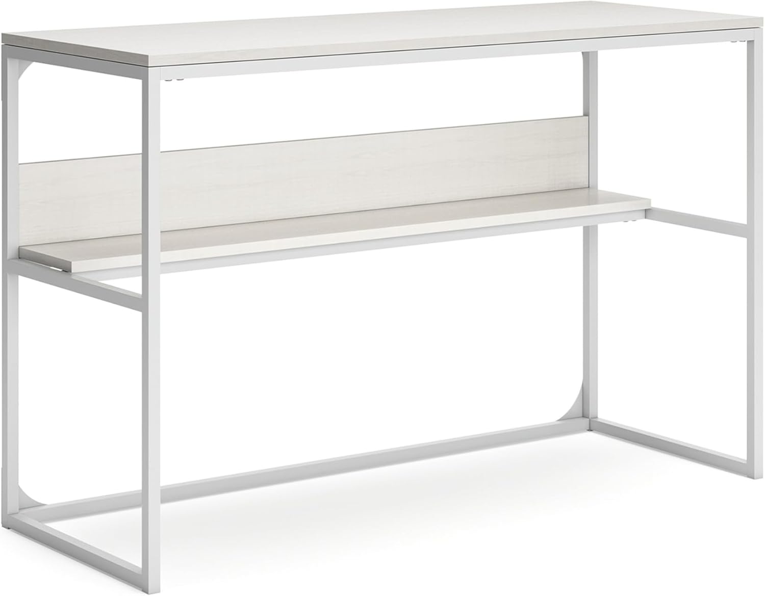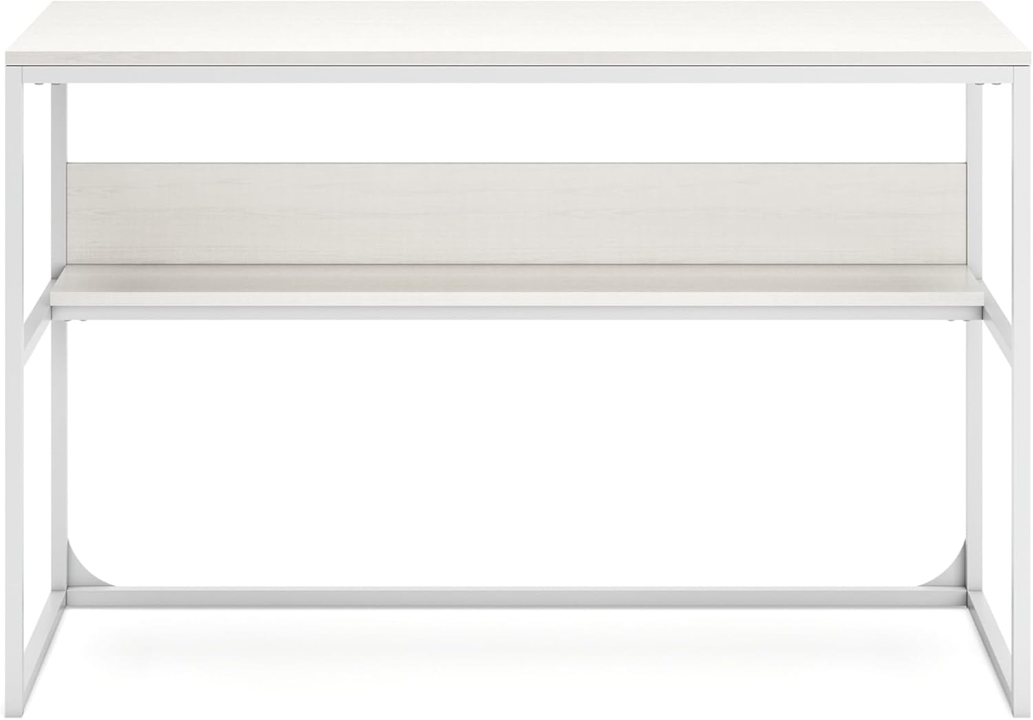Simplify your workspace with this home office desk, featuring a clean, minimalist design that enhances modern home offices. The desk’s wood surface with a replicated pickled white oak wood grain ensures a stylish yet practical work area. A metal frame with a powder-coated finish adds durability, while the small shelf on the back provides additional storage. Check out our Deni collection for more.