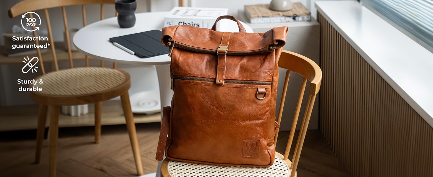 To prolong the life of leather goods we recommend regularly cleaning and waterproofing your bags. To do this we suggest using a clean damp cloth to wipe your bag, applying a natural wax-based care product, and finishing with a waterproofing spray.