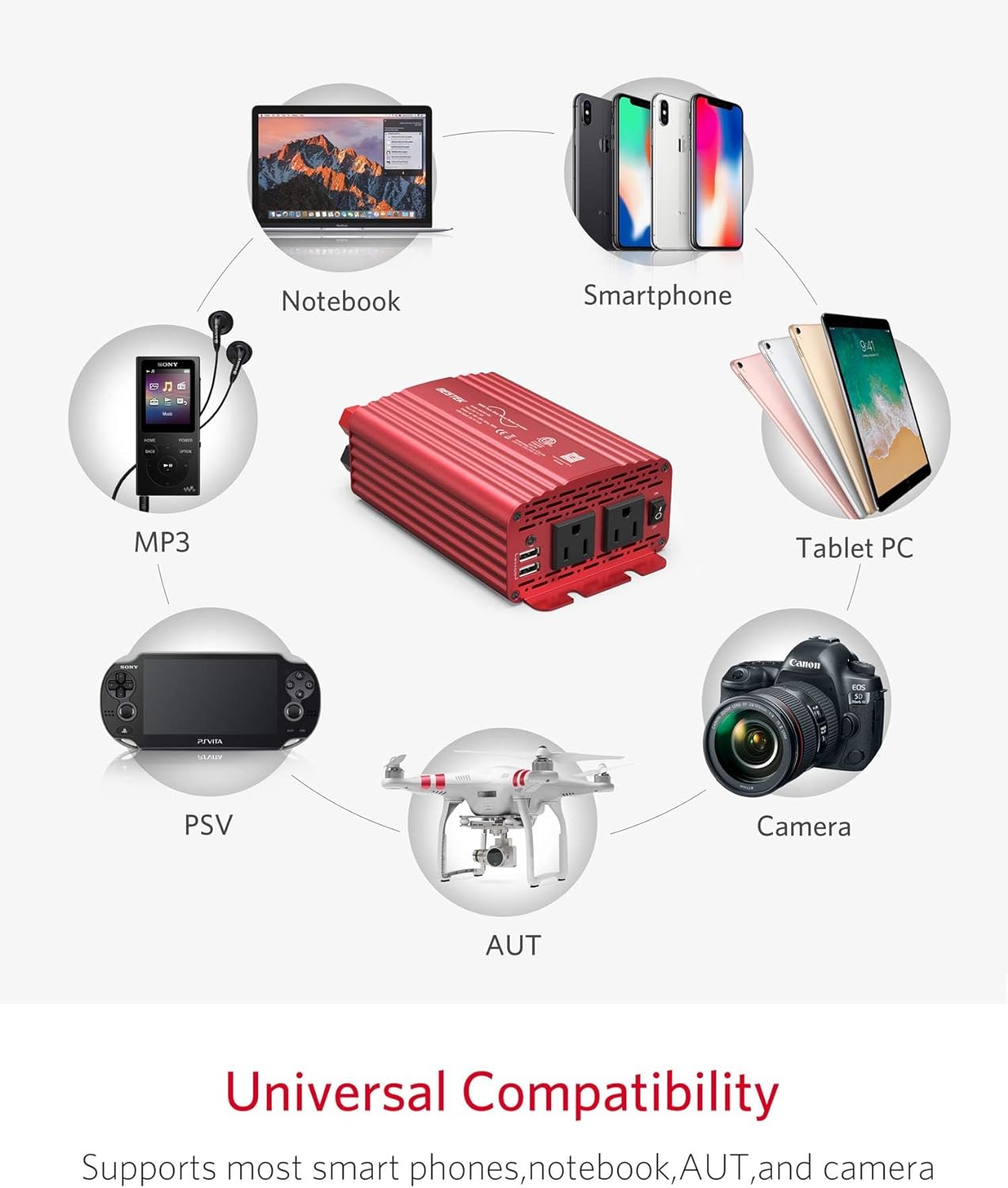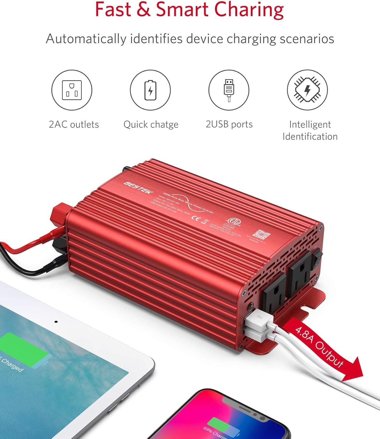 BESTEK 300W pure sine wave power inverter DC 12V to AC 110V automotive inverter. Car charger with 4.2A dual USB charging port and 2 AC sockets. Provide multiple protections such as overvoltage and overload. The built-in intelligent fan can cool down at high temperature and is very quiet during operation. ETL is listed.