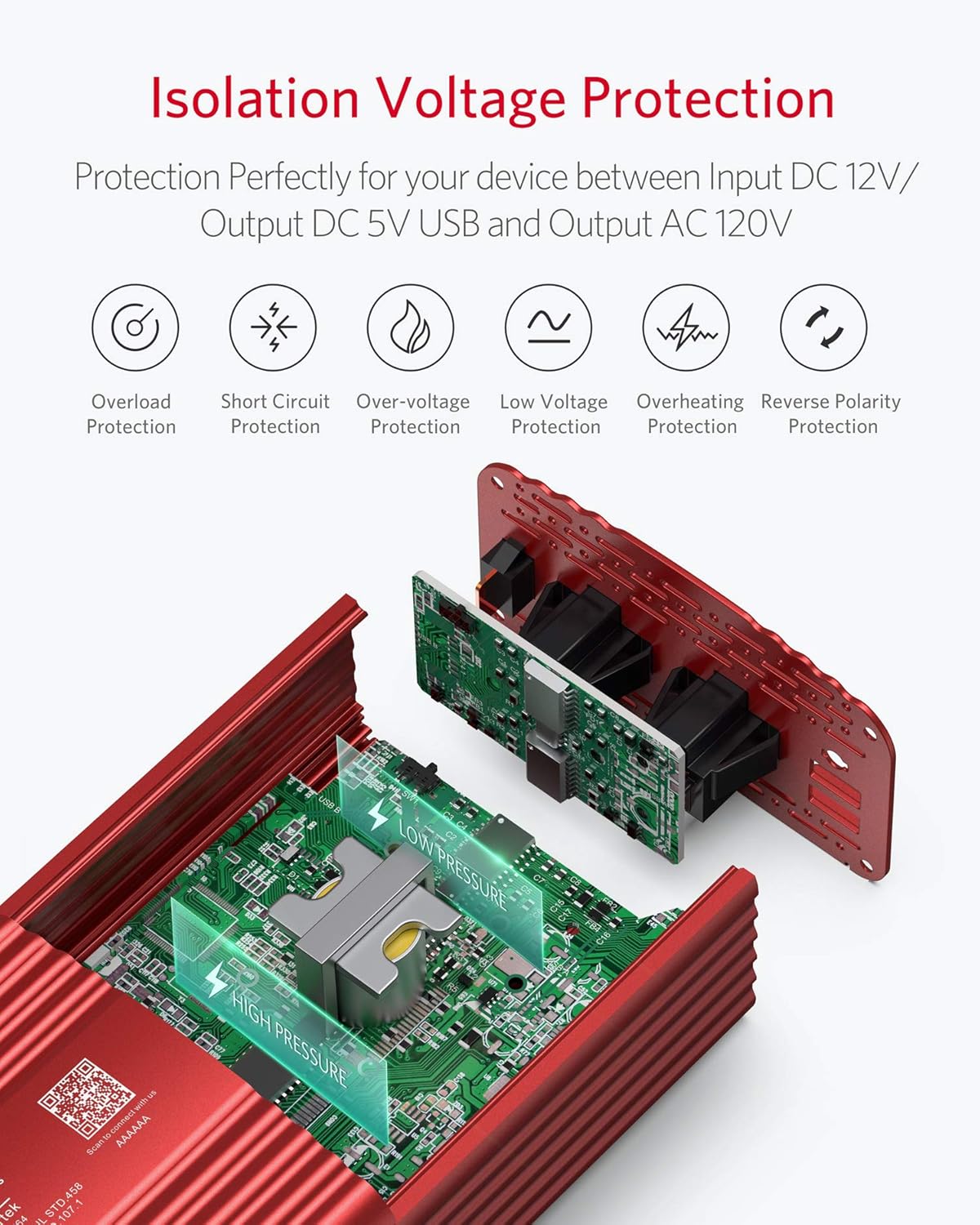 Isolated Voltage Protects Perfectly for your device from Over-voltage,Under-voltage,Overheat,Overload,Reverse Polarity,Short circuit.it will not drain your battery dry because of an under-voltage protection point.The Inverter does automatically sense overload condition and shuts down AC power when the load exceeds 500W.You will need to power Off/On to reset the overload condition indicated by the Flashing Red.
