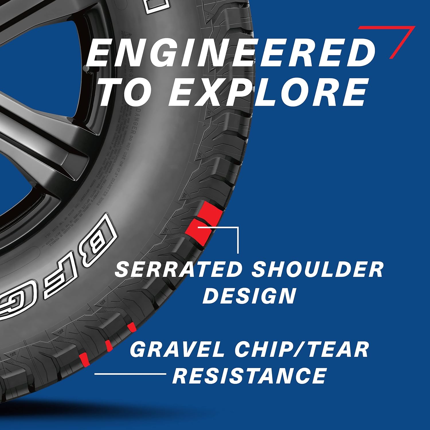BFGoodrich introduces the versatile and dependable BFGoodrich Trail-Terrain T/A tire. Road worthy and adventure ready, this rugged tire is durable enough for paved or unpaved roads. Built to last, the BFGoodrich Trail-Terrain T/A tire has an optimized footprint design featuring Full-Depth 3-D Locking Sipes that provide excellent tread block stability for even wear. As a result, you get a tire with longer tread life and a quiet, comfortable ride. Engineered so you can explore, the BFGoodrich Trail-Terrain T/A tire resists chipping and tearing in occasional gravel road usage. Plus, the serrated shoulder design makes it ideal for soft-soil traction in light off-pavement situations without compromising road noise. Don’t let adverse weather stand in your way either. The BFGoodrich Trail-Terrain T/A tire provides performance you can confidently rely upon, rain, snow or shine. The BFGoodrich Trail-Terrain T/A tire is backed by a 60,000-Mile Warranty and a 60-Day Satisfaction Guarantee, so you can be set for what's next. [1] Based on a treadwear test using tires in size 265/70R17 115T on a 2020 Ford F150 4x4. Actual on-road results may vary. [2] Excludes Original Equipment Tires [3] Guarantee applies to up to 6 tires per customer. Guarantee applies only to tires that were purchased and mounted and does not apply to exchanged tires that were provided under this guarantee. The guarantee does not include the cost of valve stems. Tires that are damaged due to misuse or misapplication, road hazards, mechanical problems related to the vehicle, use in any racing-related activities, or competitive events, or tires that are removed from the original vehicle on which they were installed, are excluded from guarantee.
