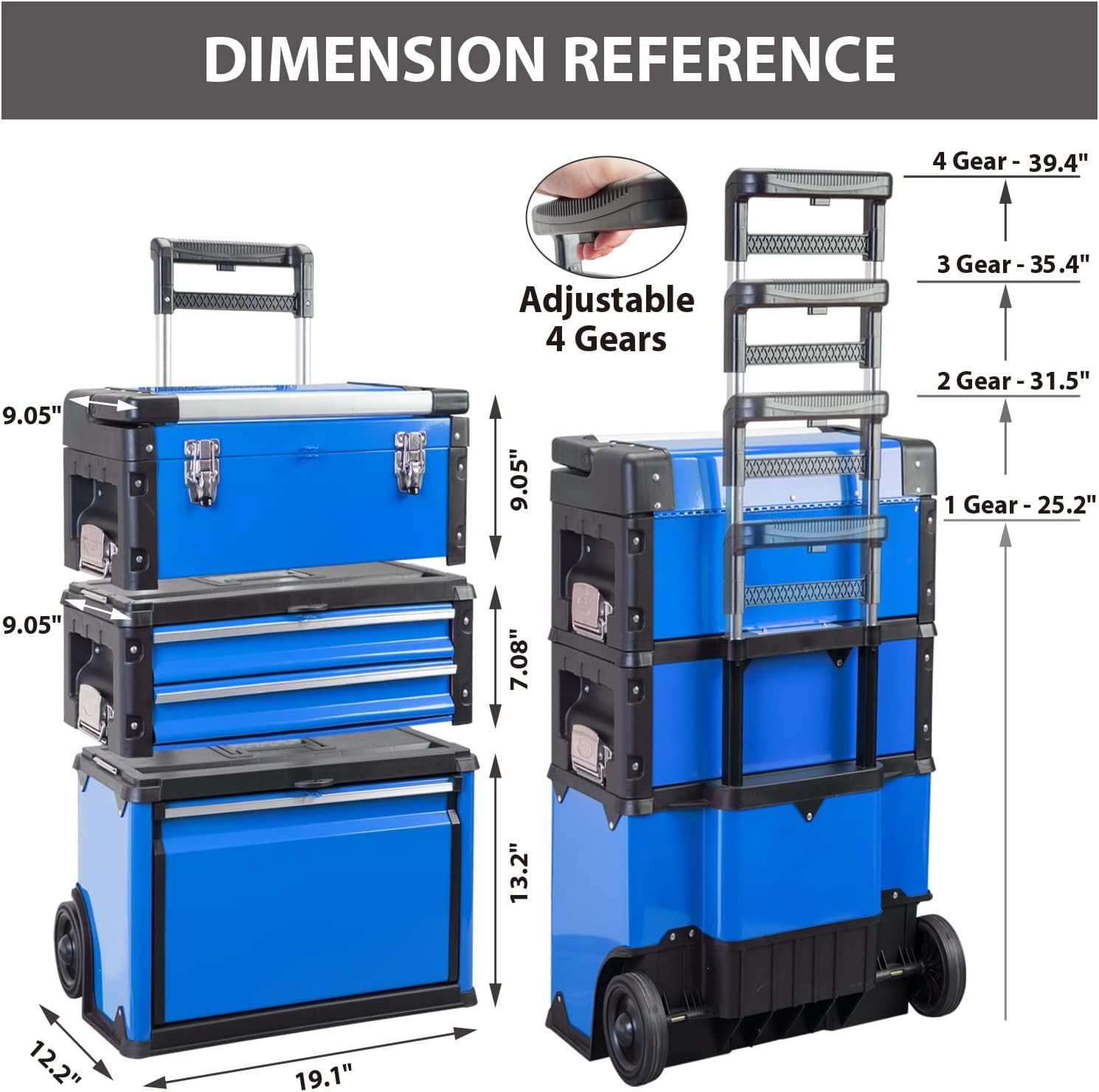 Top Section:Removable Tray and Double Lock Center Section:2-Layer Smooth Sliding Drawer Bottom Section:Tilt Drawer with Large Storage and Telescoping Handle Rolling tool box is made of rigid metal construction by strength testing it's durability that can withstand everything you need for off-site jobs - keep your tools and equipment safe.