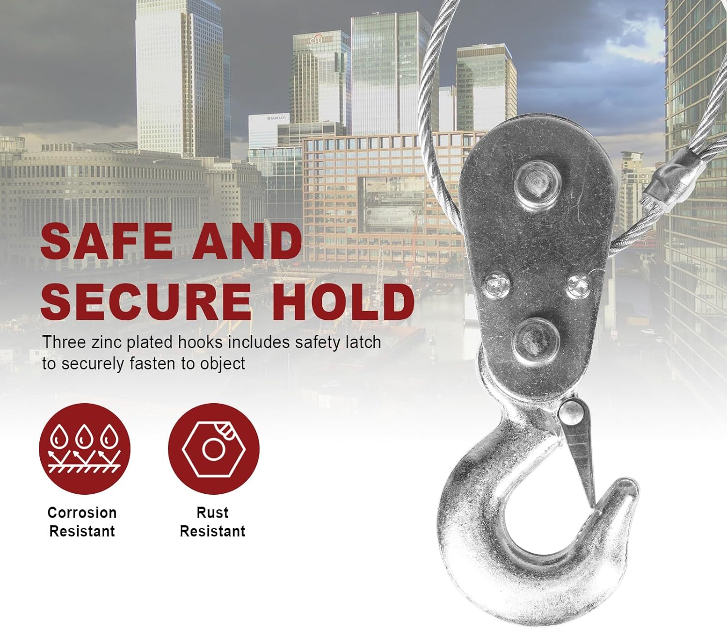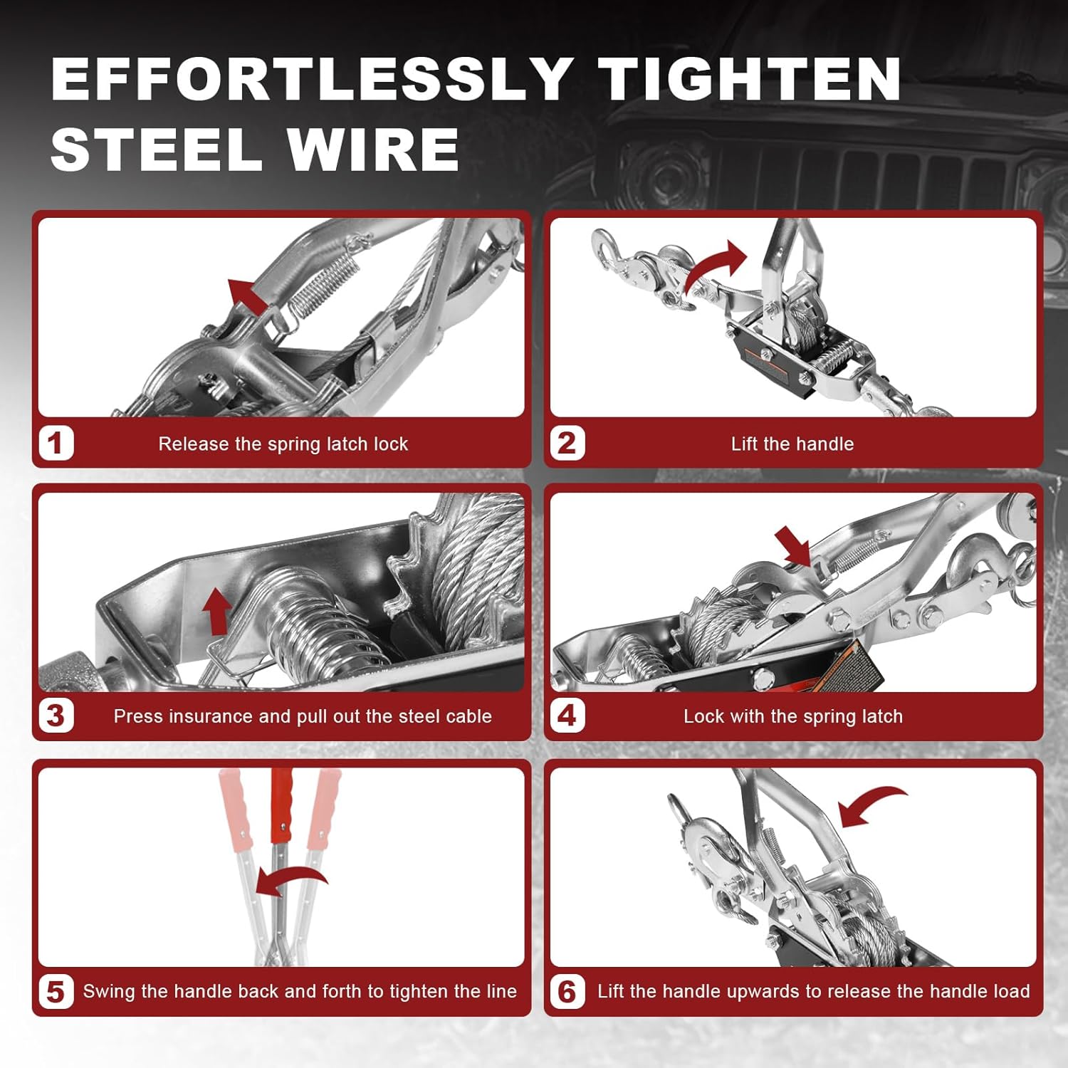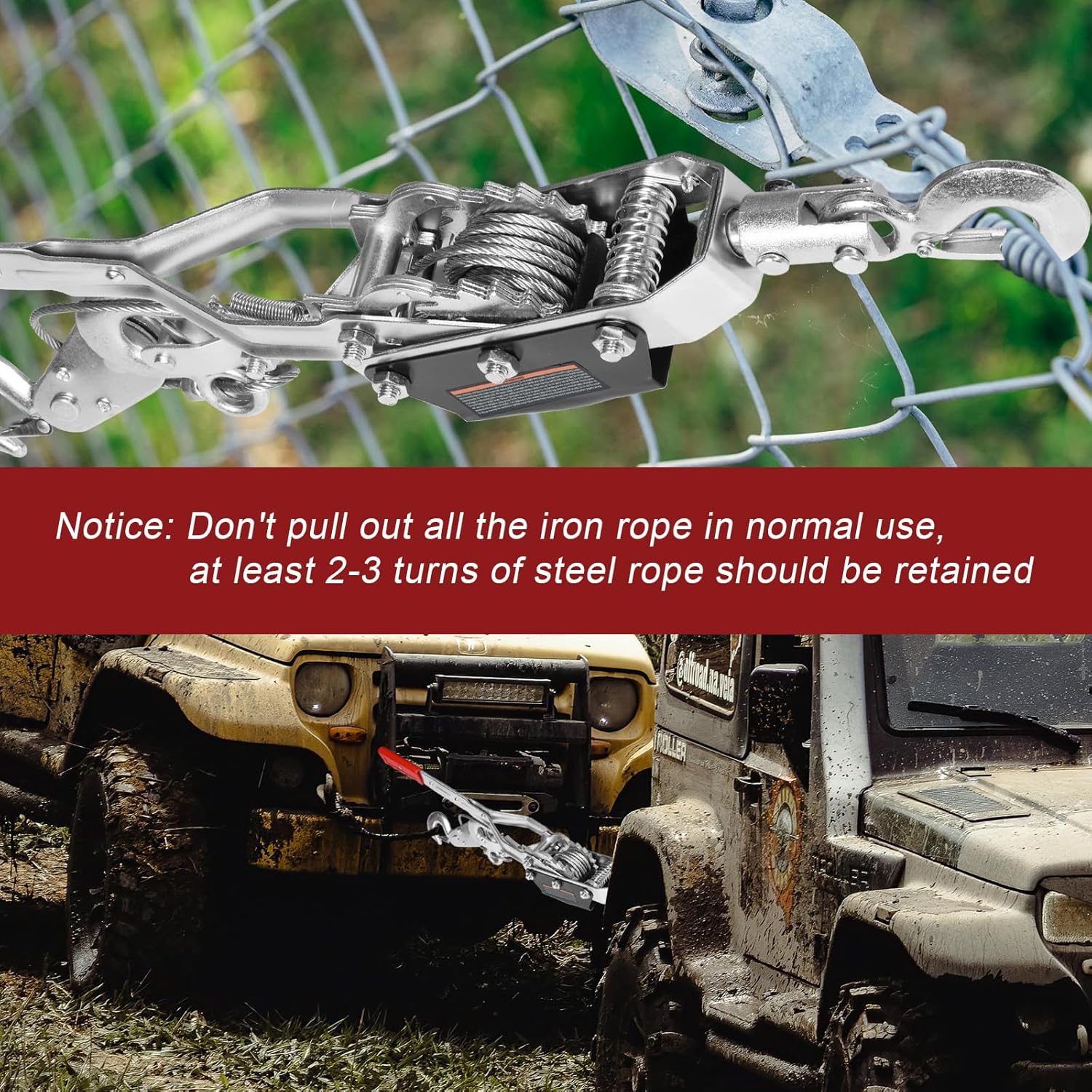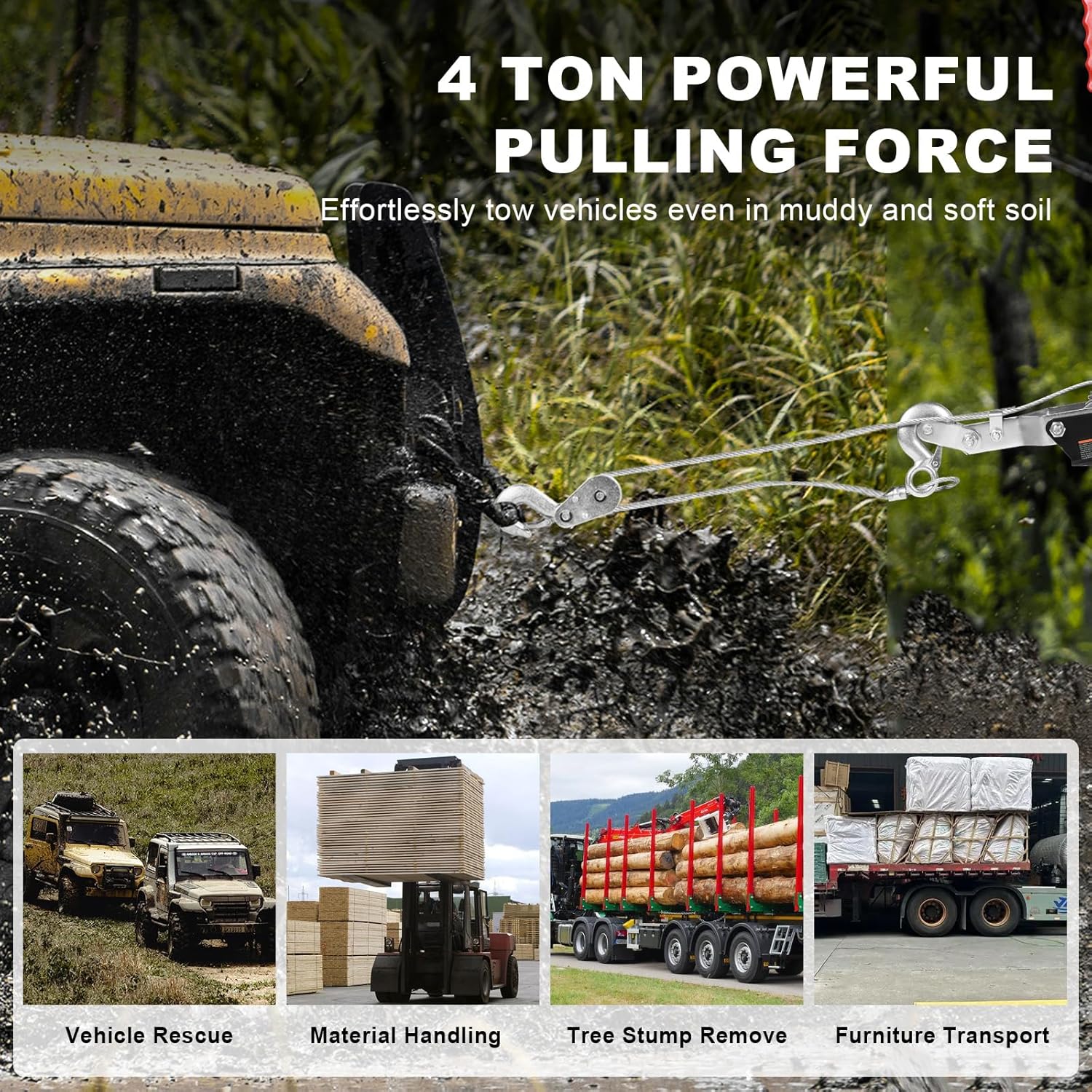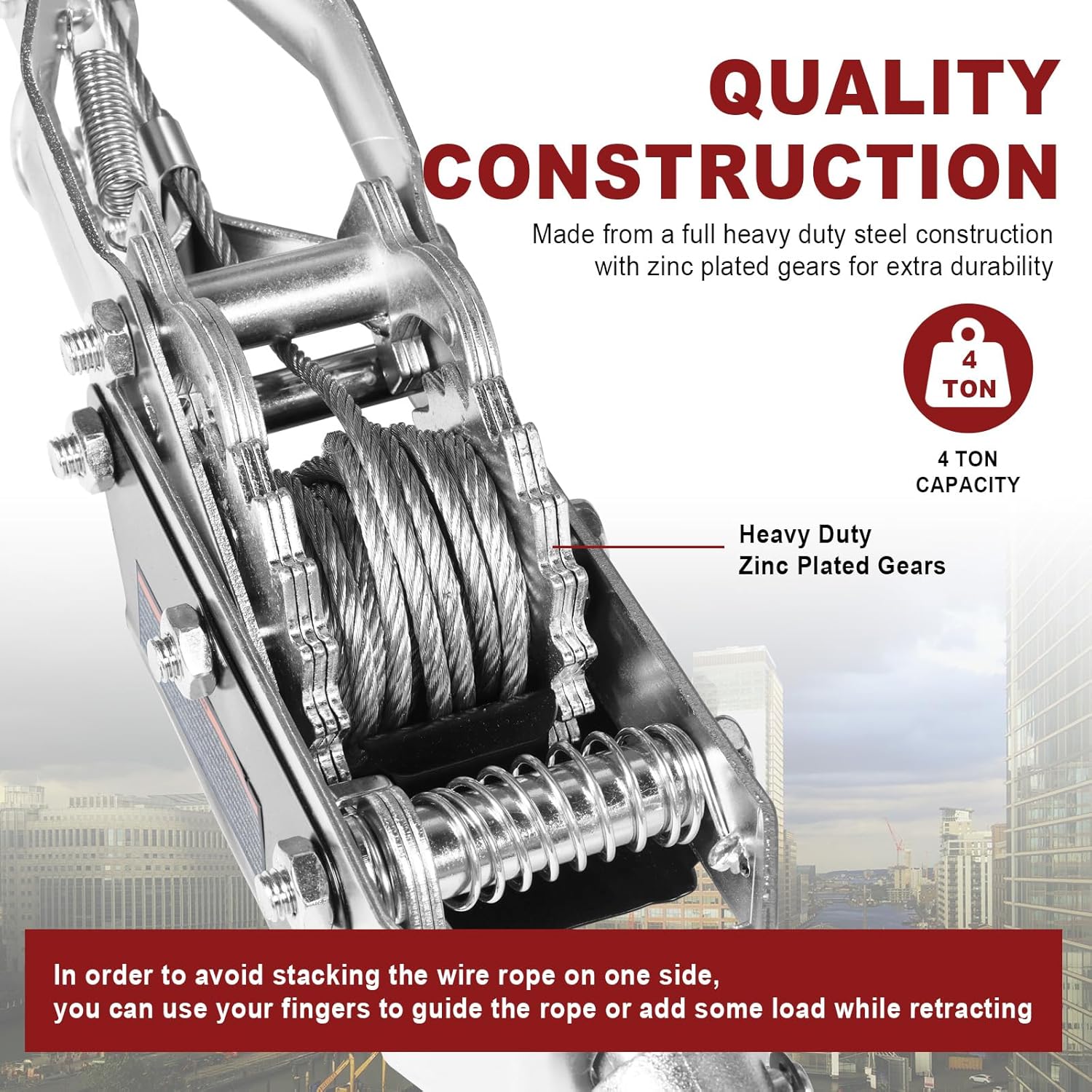 The Torin BIG RED T32054 come-along double gear hand cable puller is ideal for lifting, lowering, pulling, and stretching. The solid steel body offers durable and long-lasting performance. It's equipped with 3 drop-forged steel safety hooks with a spring latch. Features a powerful hand-crank ratchet action and an automatic notch-at-a-time let-down release. The double wheel makes the mechanism to move easier and a double claw provides added stability. Heavy-duty aircraft cable measures 3/16" in diameter. The 4 ton (8,000 lb) load capacity is intended for use in workshops, on farms and ranches, construction, home projects, and automotive needs.