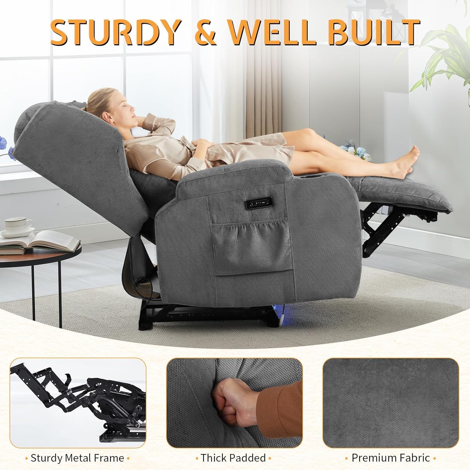 BINGTOO Electric Power Recliner Chair with Massage & Heat - Ergonomic Wingback Lounge Sofa Chair for Living Room, Home Theater Seating & RV with LED Light/Cup Holders/USB Ports, Grey