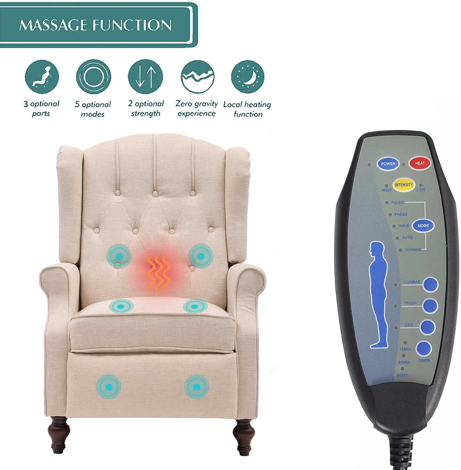 BINGTOO Wingback Recliner Chair with Massage and Heat Pushback Recliner Chair Mid Century Accent Chairs Tufted Fabric with Rivet Decoration for Living Room Bedroom