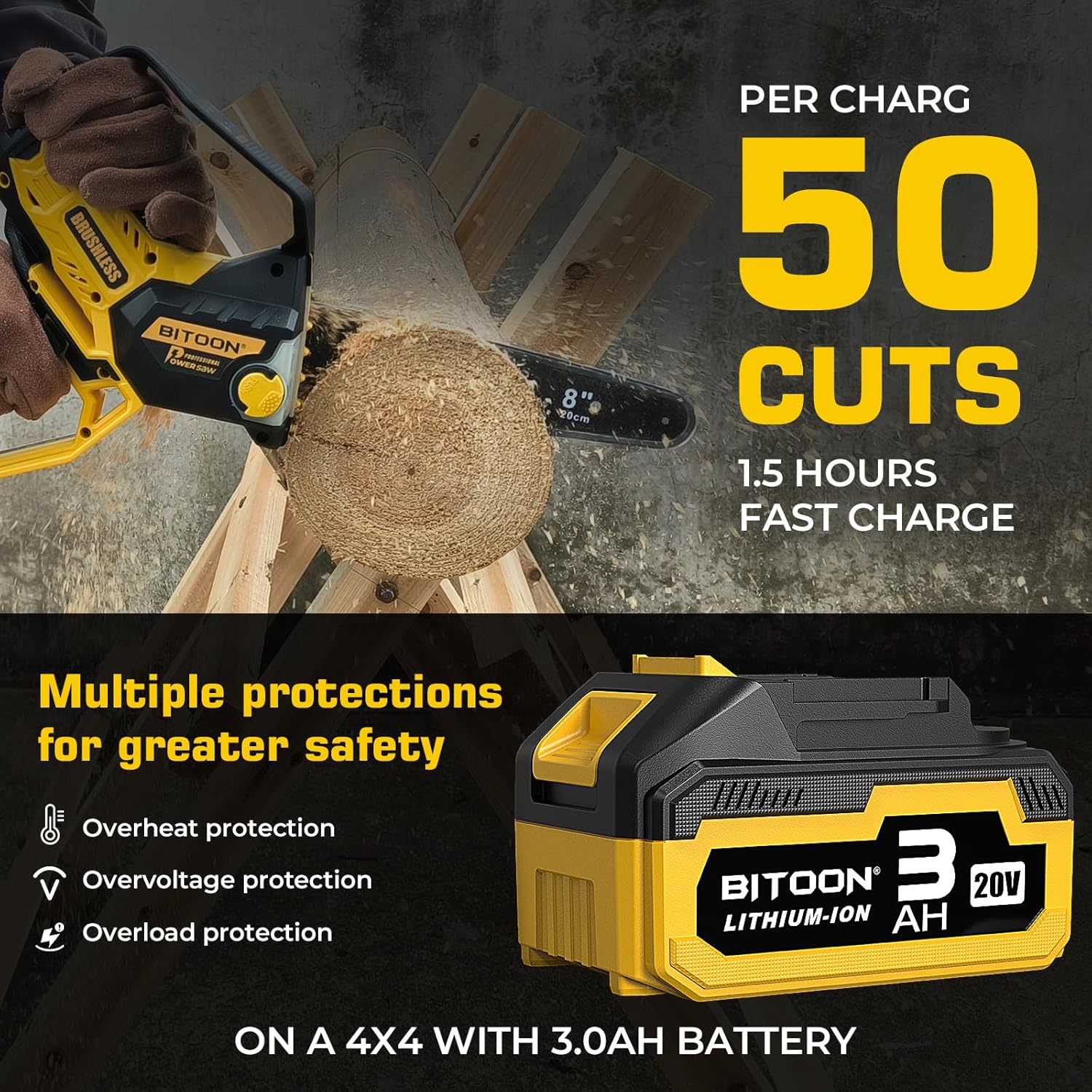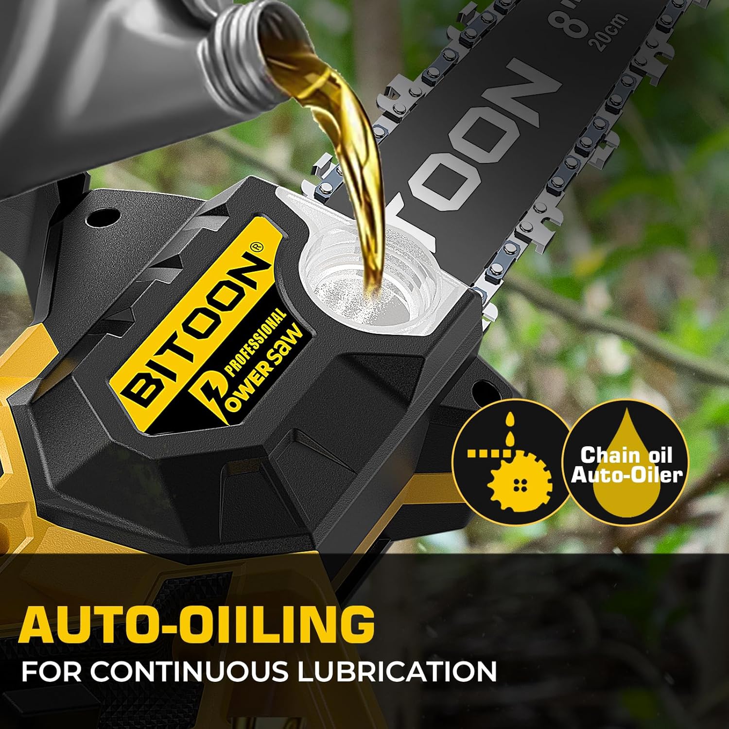 BITOON 8-Inch Mini Chainsaw with 2PCS 3.0Ah Battery and Charger, Auto-Oiler, Brushless Cordless 8-Inch and 6-Inch 2-in-1 Pruning Chain Saw, Portable Electric Chainsaw for Cutting Wood, Branches Yellow