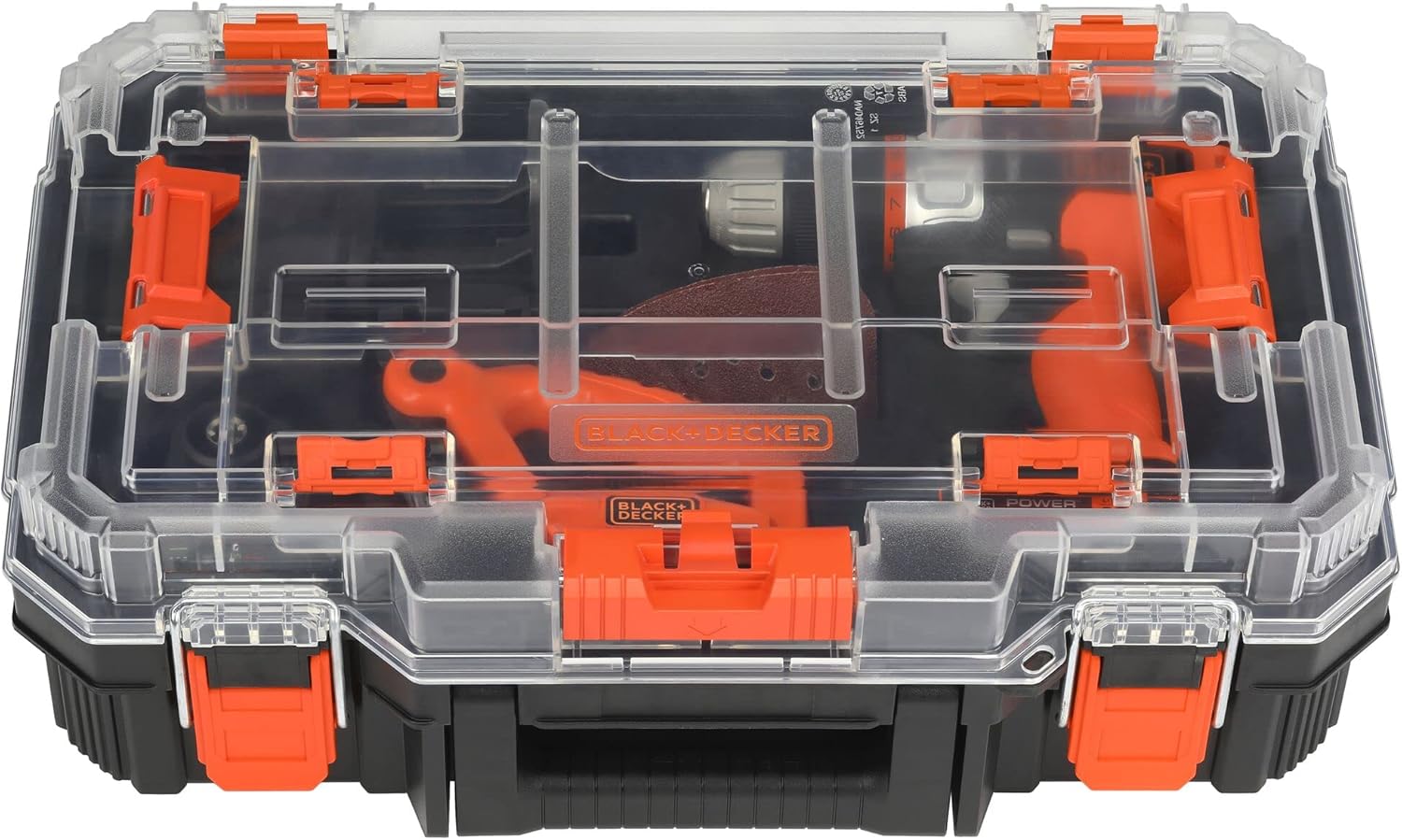This BLACK+DECKER 20V MAX* POWERCONNECT cordless 4-tool combo kit includes a drill/driver, jigsaw, sander, and an LED work light. The drill/driver is designed with an 11-position clutch to help prevent you from stripping and overdriving screws, while its keyless chuck makes swapping out the bit really easy. The jig aw makes straight, curved, angled, and plunged cuts in wood and metal. The sander attachment has a compact design for user control for access in tight spaces. And the versatile pivoting LED work light is an all-around great go-to for lighting up dark areas. INCLUDES: BDCDMT120 MATRIX 20V MAX Power Unit, (1) BDCMTDD Drill/Driver Attachment, (1) Double-ended Bit, (1) BDCMTS Sander Attachment, (6) Sheets of Sandpaper: 60/120/240 grit, (1) BDCMTJS Jigsaw Attachment, (1) Wood Scrolling Blade, (1) 20V MAX LED Work LIght, (1) 20V MAX Lithium Ion Battery, (1) 20V MAX Charger, (1) Storage Case
