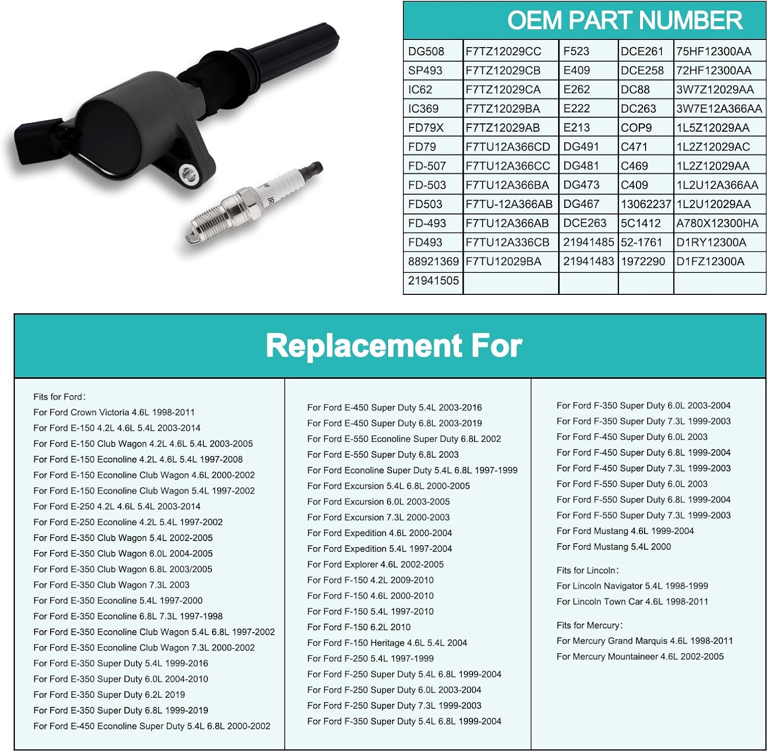 Black DG508 Ignition Coil Pack 8PCS/SP493 SP479 Spark Plug 4.6L 5.4L V8 For F150 F250 F350 E150 E250 E350 E450 Econoline Super Duty Excursion Expedition,Lincoln Navigator Town Car Mercury Grand DG457