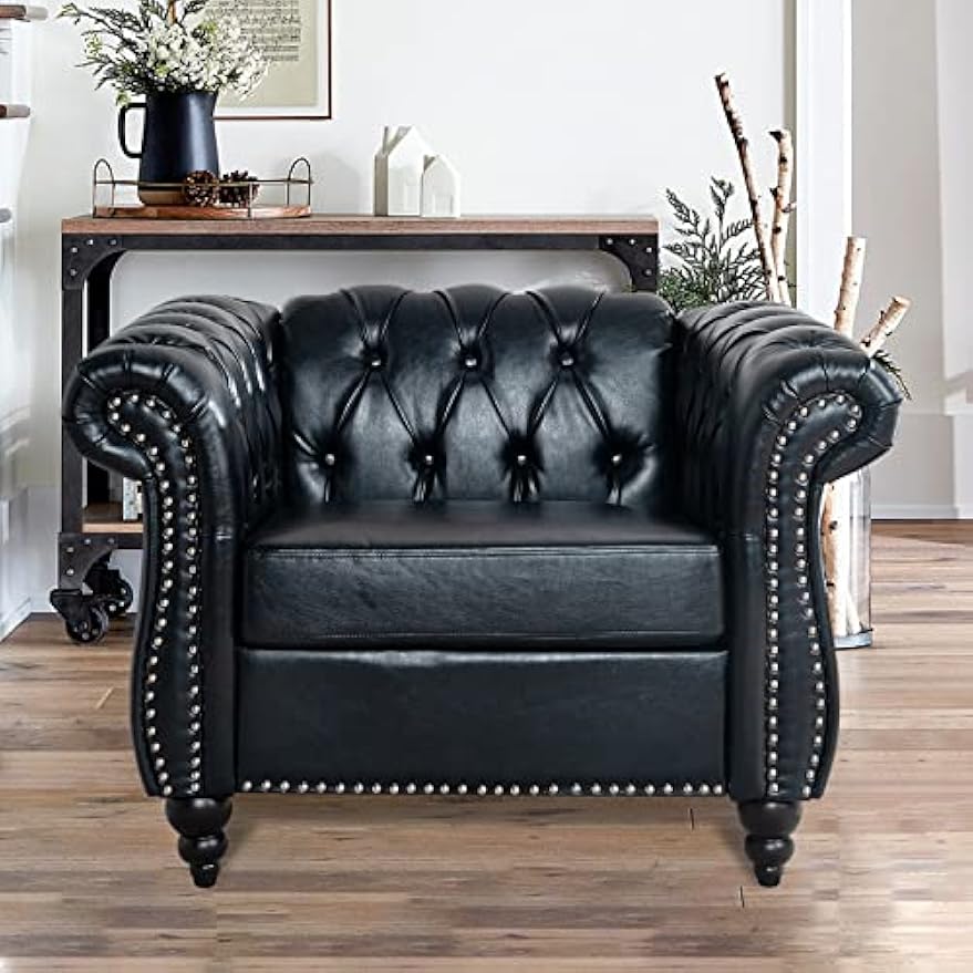 Black Faux Leather Chesterfield Accent Chair with Tufted Upholstery, Wingback Design & Club Style for Living Room, Bedroom, Office Furniture