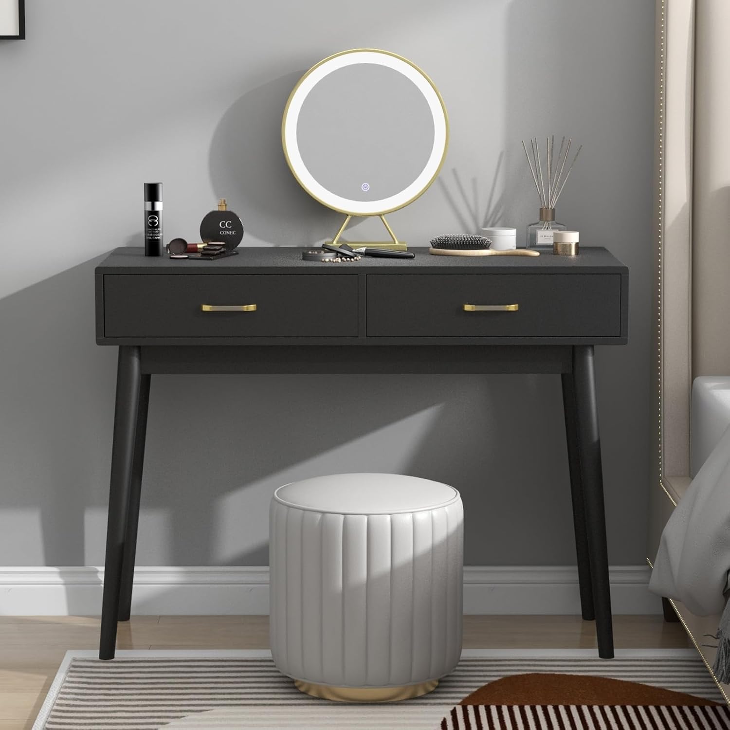 Black Small Writing Desk with Drawers, 40 Inch Writing Desk for Home Office, Vanity Desk with Solid Wood Leg for Small Spaces
