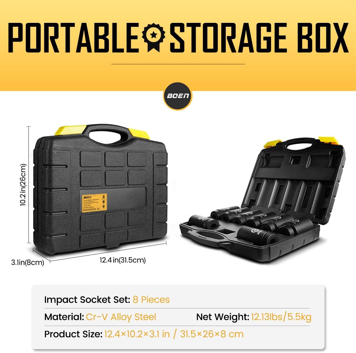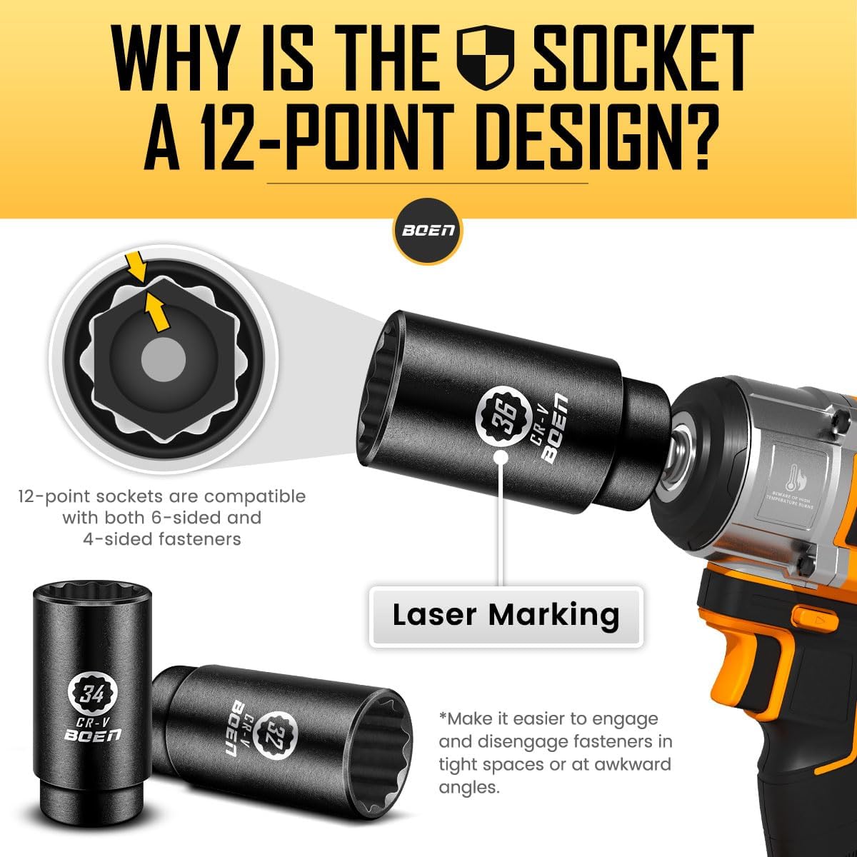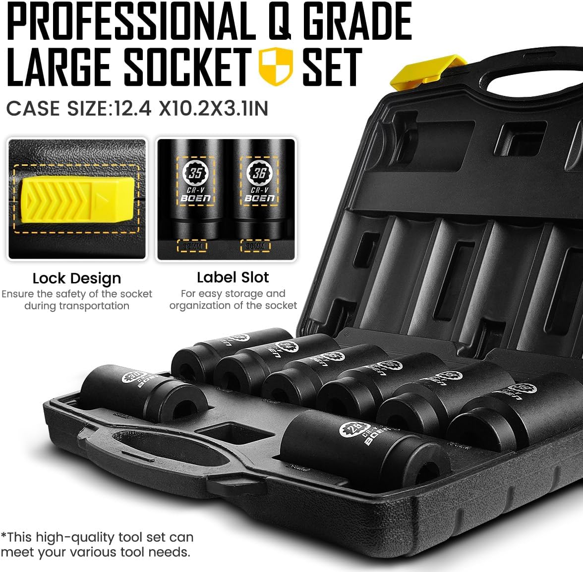 BOEN 8-Piece 1/2" Drive Deep Impact Socket Set, 12-Point Metric Spindle Axle Nut Large Socket Set, (29 mm, 30 mm, 32 mm, 34 mm, 35 mm, 36 mm, 38 mm, 39 mm), Chrome Vanadium Steel