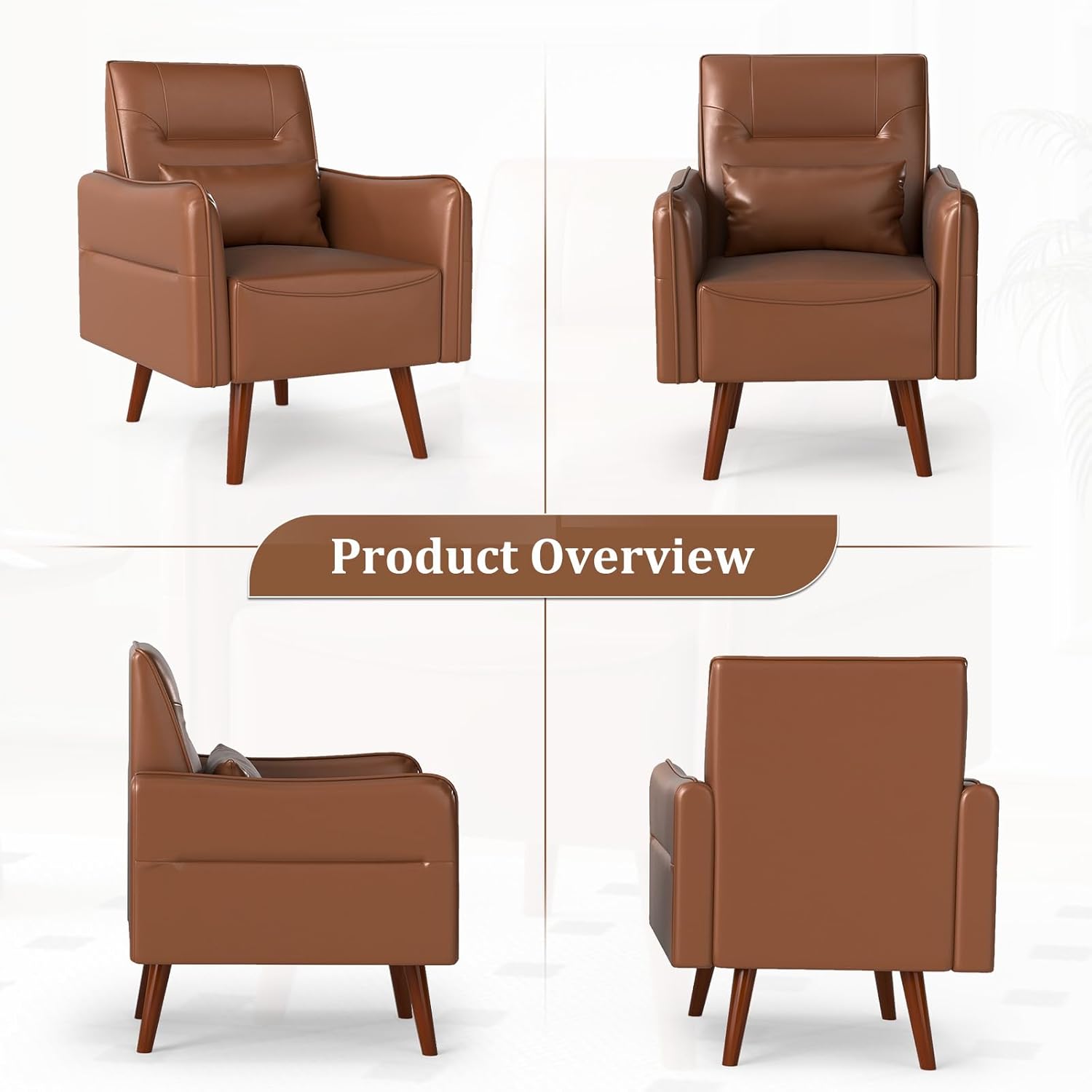 Bonzy Home Mid-Century Modern Faux Leather Accent Chair Set of 2 for Living Room,Upholstered Armchair with Pillow and Solid Wood Legs, Comfortable Lounge Chair for Bedroom or Office,Brown
