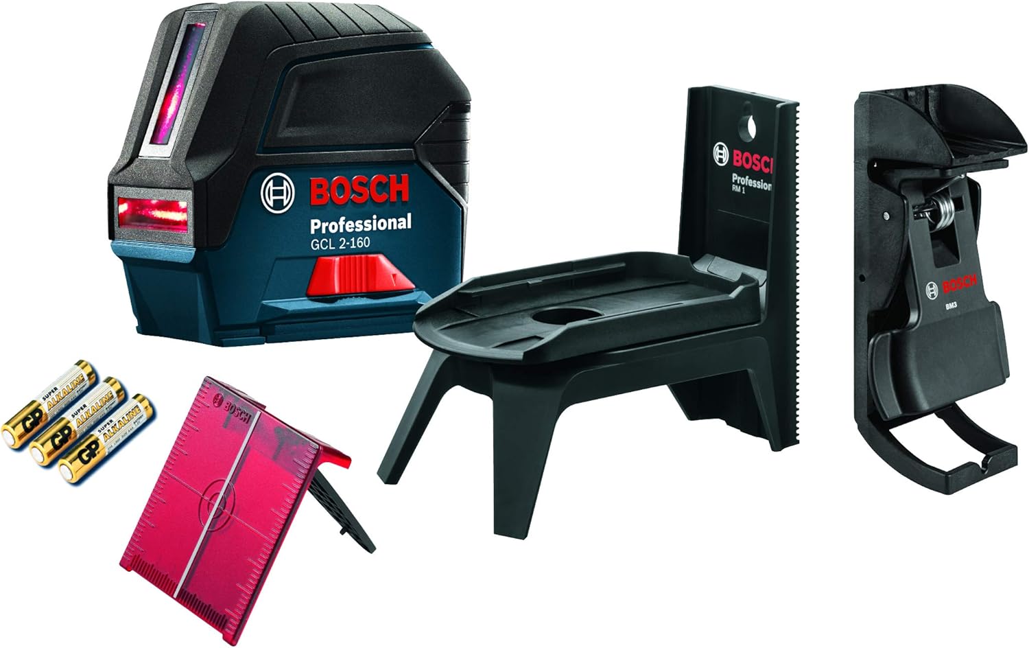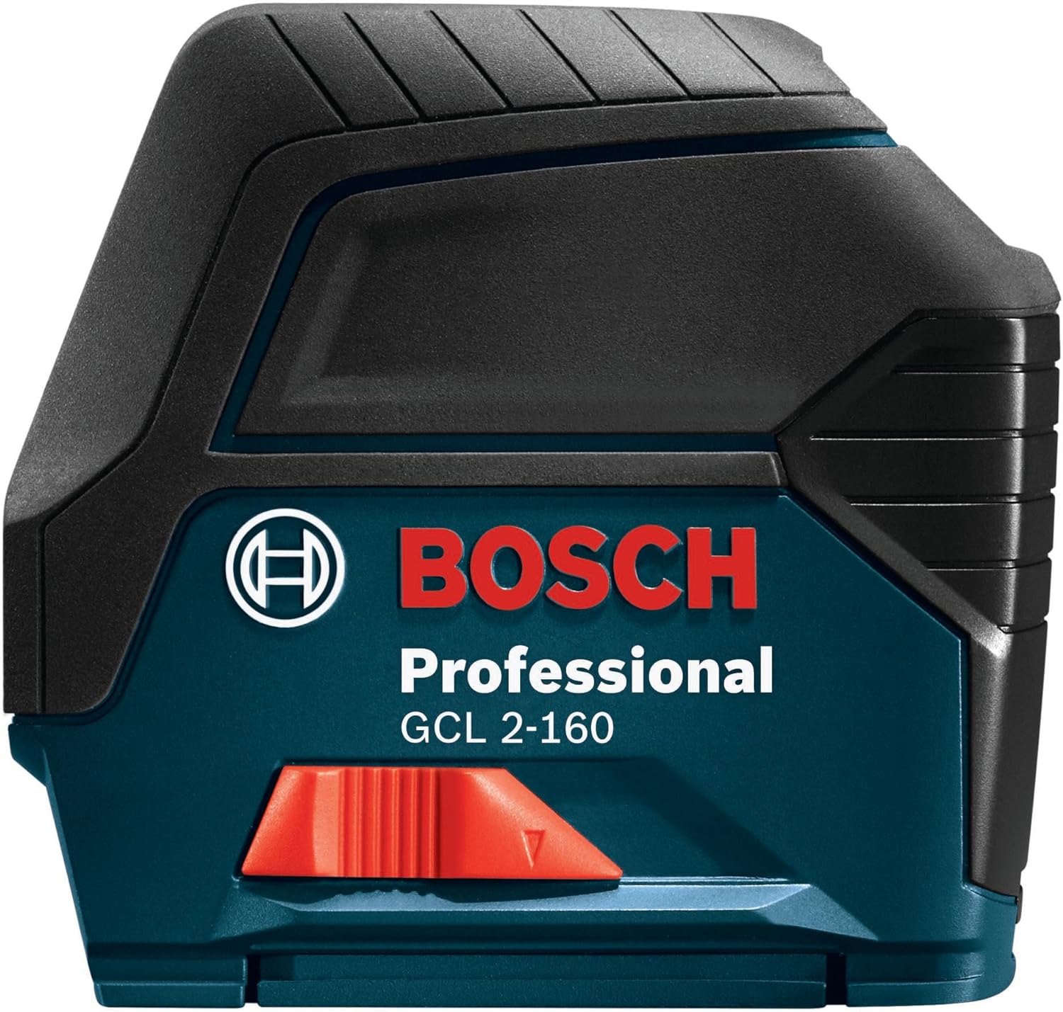 BOSCH GCL 2-160 65 Ft Self-Leveling Cross-Line Laser with Plumb Points, Includes Magnetic Rotating Mount, Ceiling Grid Clip, Laser Target Plate, 3 AA Batteries, & Hard Carrying Case