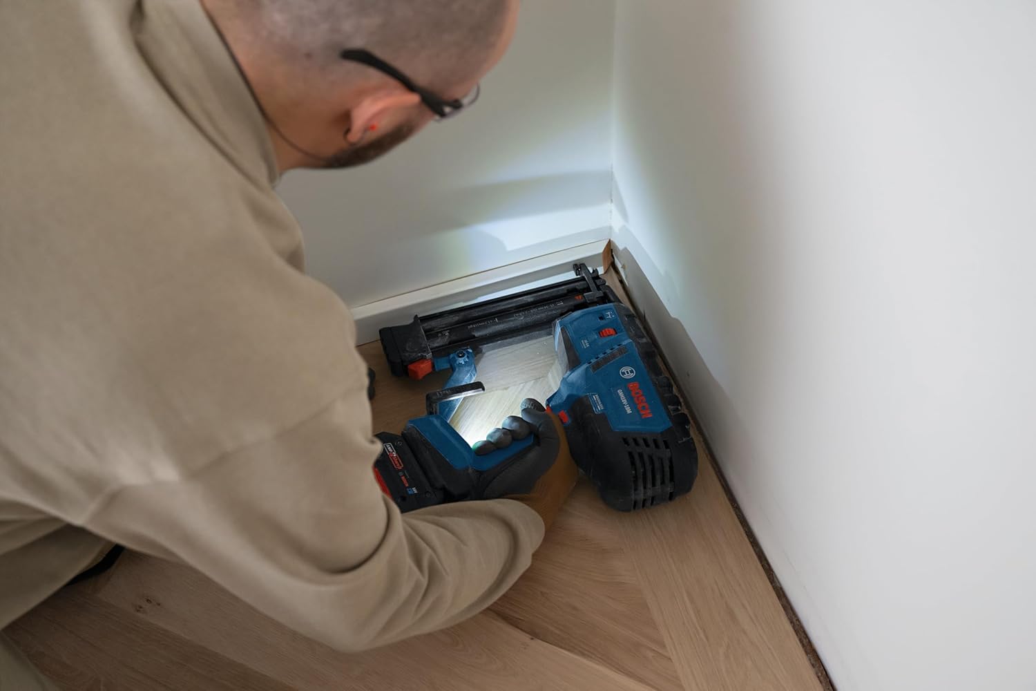 The Bosch GNH18V-18M 18V Brushless 18-gauge Brad Nailer delivers power and precision in a cordless solution. Experience uninterrupted productivity while navigating tight spaces and hard-to-reach areas by eliminating the hassle of compressors and hoses. Compact and ergonomically designed, the 18-gauge cordless brad nailer gives workers the flexibility to access tight spaces, while also helping reduce worker fatigue. The efficient, brushless motor delivers the power to consistently sink 18-gauge brad nails ranging from 5/8 - 2-1/8 In. which makes it ideal for a clean finish in precise decorative work. The 18-gauge Brad nailer has a magazine capacity of 105 nails. When paired with a CORE18V 4 Ah battery (sold separately), it can fasten up to 2,000 nails per charge, ensuring extended productivity. One-handed activation simplifies the process for quick and hassle-free nailing, catering to both right- and left-handed users. A double LED light illuminates the work area for more precise and efficient nailing. The dry-fire lockout feature automatically stops operation when down to the last five nails. This not only prevents blank firing but also safeguards the workpiece from potential damage. Make easy and precise adjustments to the depth setting with the ergonomic thumb wheel. Additionally, downtime is minimized as jammed nails can be quickly cleared through a tool-free release mechanism while on the job. An intuitive user interface allows for easy toggling between single and bump-fire modes, turns the LED light on and off, and informs the worker of scheduled maintenance of the tool. An integrated heavy-duty belt hook provides easy portability and storage between tasks.