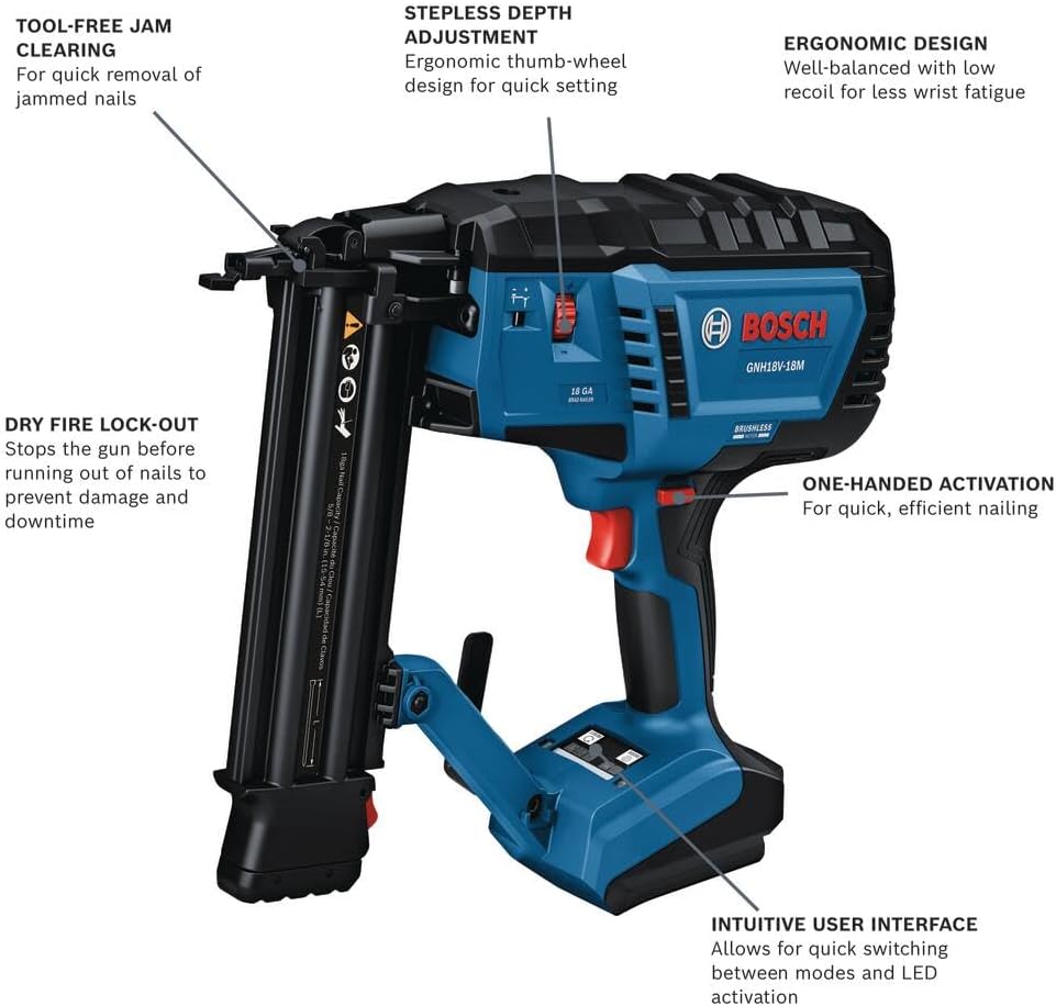 BOSCH GNH18V-18MN 18V Brushless 18-Gauge Brad Nailer - Cordless Power, Fastens up to 2,000 Nails per Charge, One-Handed Activation, Tool-Free Jam Clearing, Double LED Light (Bare Tool)