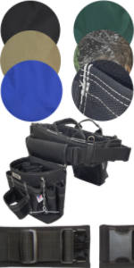 - 6 color choices (black, tan, green, blue, backwoods - camo, black w/ white stitching) on the Ultimate tool belts and 4 (black, green, blue, black w/ white stitching) on the Professional tool belts